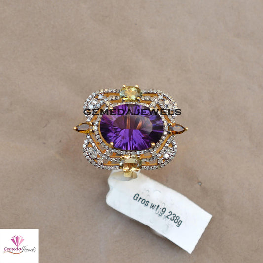 Beautiful Amethyst Gemstone Ring, Multi Tourmaline 925 Silver Ring, 14k Gold Vermeil Jewelry, Pave Diamond Jewelry, Women's Gift Jewelry