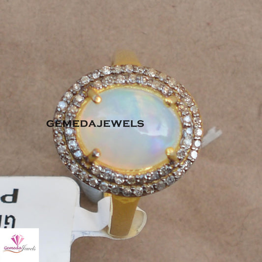 925 Silver Jewelry Genuine Opal Gemstone Ring, Pave Diamond Ring Yellow Gold Vermeil Jewelry, Gemstone Diamond Jewelry, Valentine's Gift