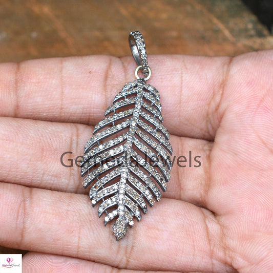 1.33Cts Genuine Pave Diamond Pendant, Diamond Feather Jewelry, Sterling Silver, Leaf Diamond Jewelry, 16" Chain Leaf Pendant Necklace, Gifts