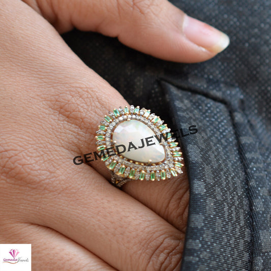100% Genuine Opal Gemstone Ring, 14k Gold Vermeil Ring, 925 Silver Jewelry, Emerald Diamond Ring, Baguette Diamond Ring, Engagement Jewelry