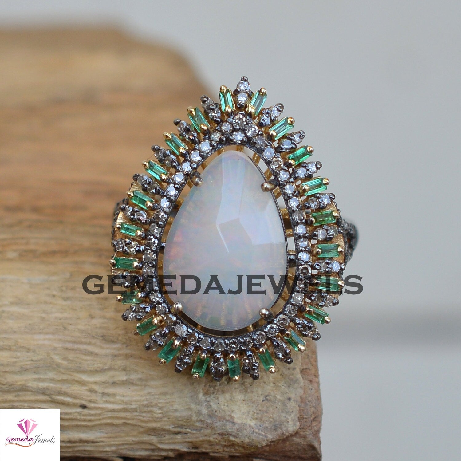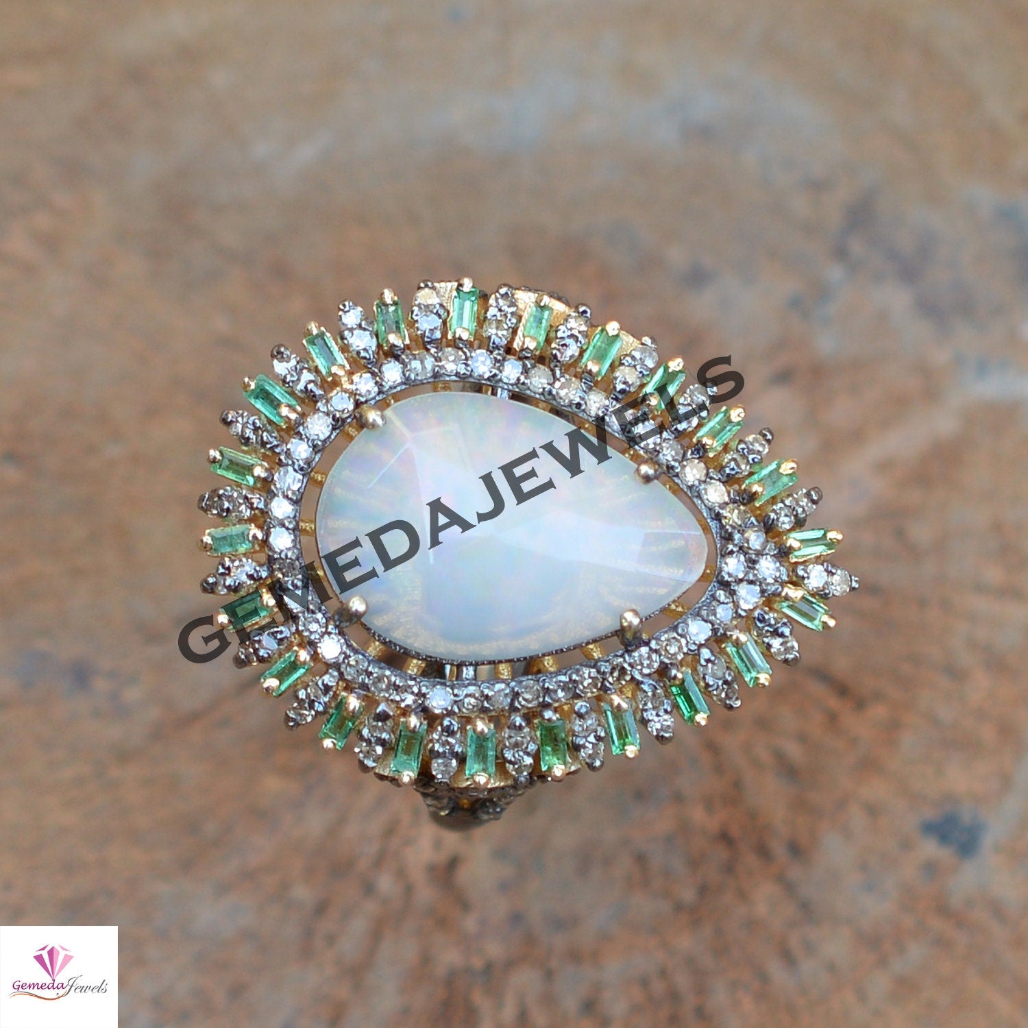 100% Genuine Opal Gemstone Ring, 14k Gold Vermeil Ring, 925 Silver Jewelry, Emerald Diamond Ring, Baguette Diamond Ring, Engagement Jewelry