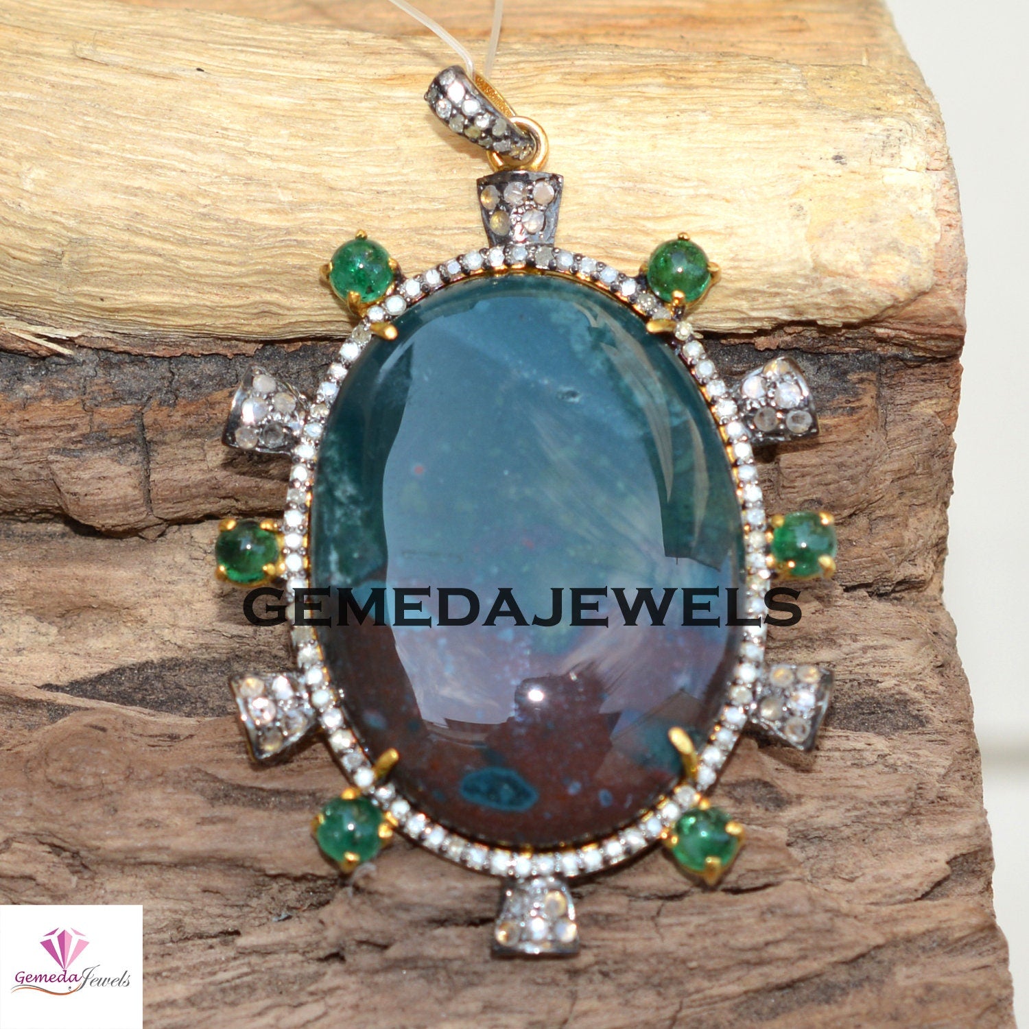 Beautiful Jasper Gemstone Pendant, Emerald Pendant, Pave Diamond Jewelry, 925 Silver Jewelry, 14k Gold Vermeil Pendant, 16" Chain Necklace