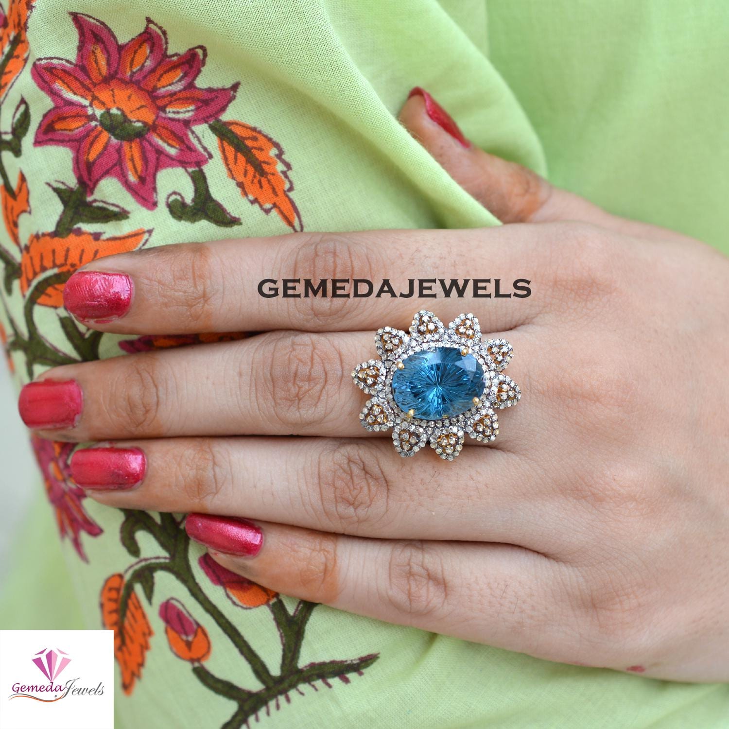 Blue Topaz Earrings, Pave Diamond Flower Earrings, 925 Silver Jewelry, Gemstone Diamond Ring Earrings JEWELLERY SET, Gold Vermeil Jewelry