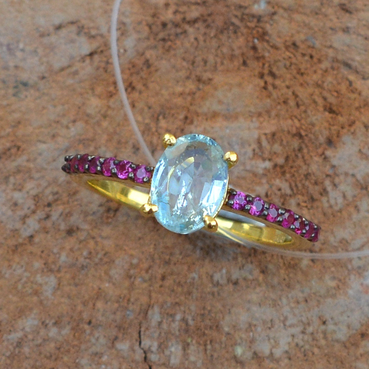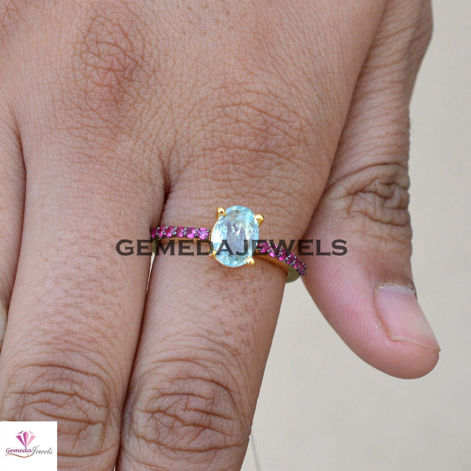 Blue Topaz Gemstone Ring, Sterling Silver Ring, Gold Plated Jewelry, Pave Diamond Ring, Ruby Silver Ring, Gemstone Diamond Jewelry, Gifts