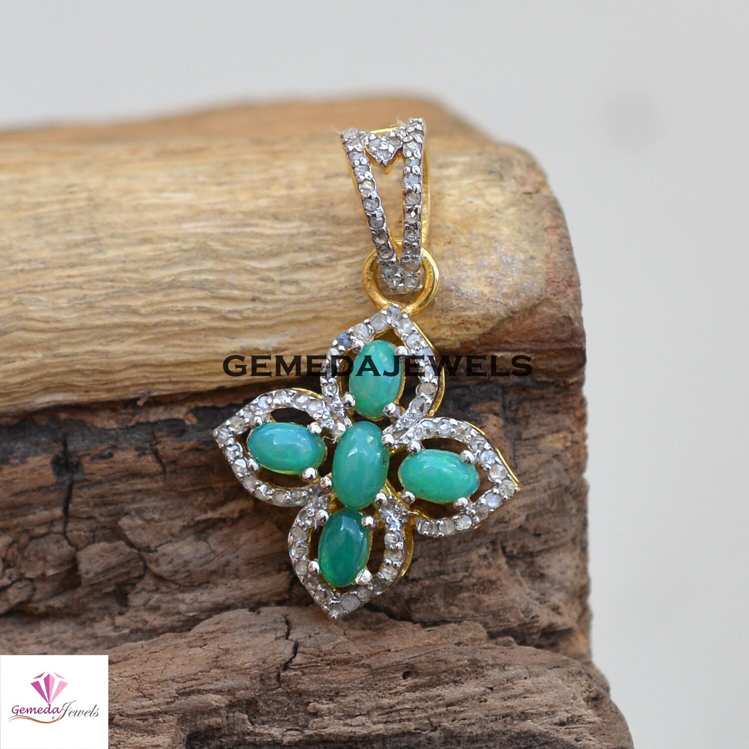 Charming Green Opal Pendant, Pave Diamond Pendant, 925 Silver Jewelry, 14k Gold Vermeil Jewelry, 16" Link Chain Necklace, Flower Pendant