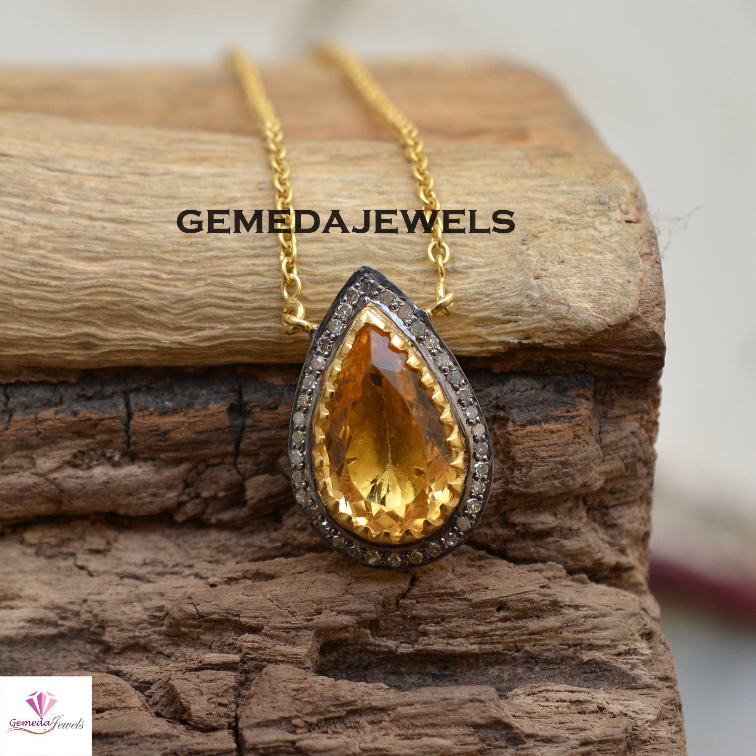 Citrine Charm Pendant, Pave Diamond Jewelry, 925 Silver Jewelry, 14k Gold Plated 18" Link Chain Necklace, Gemstone Jewelry, Gift For her