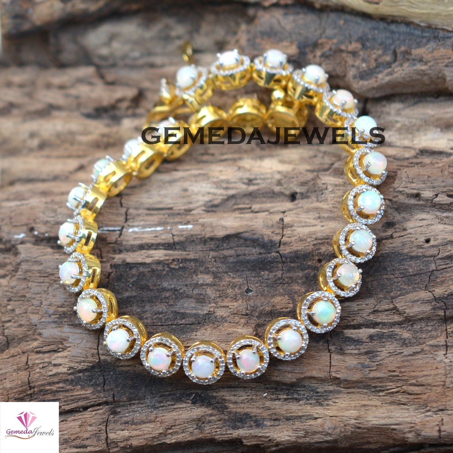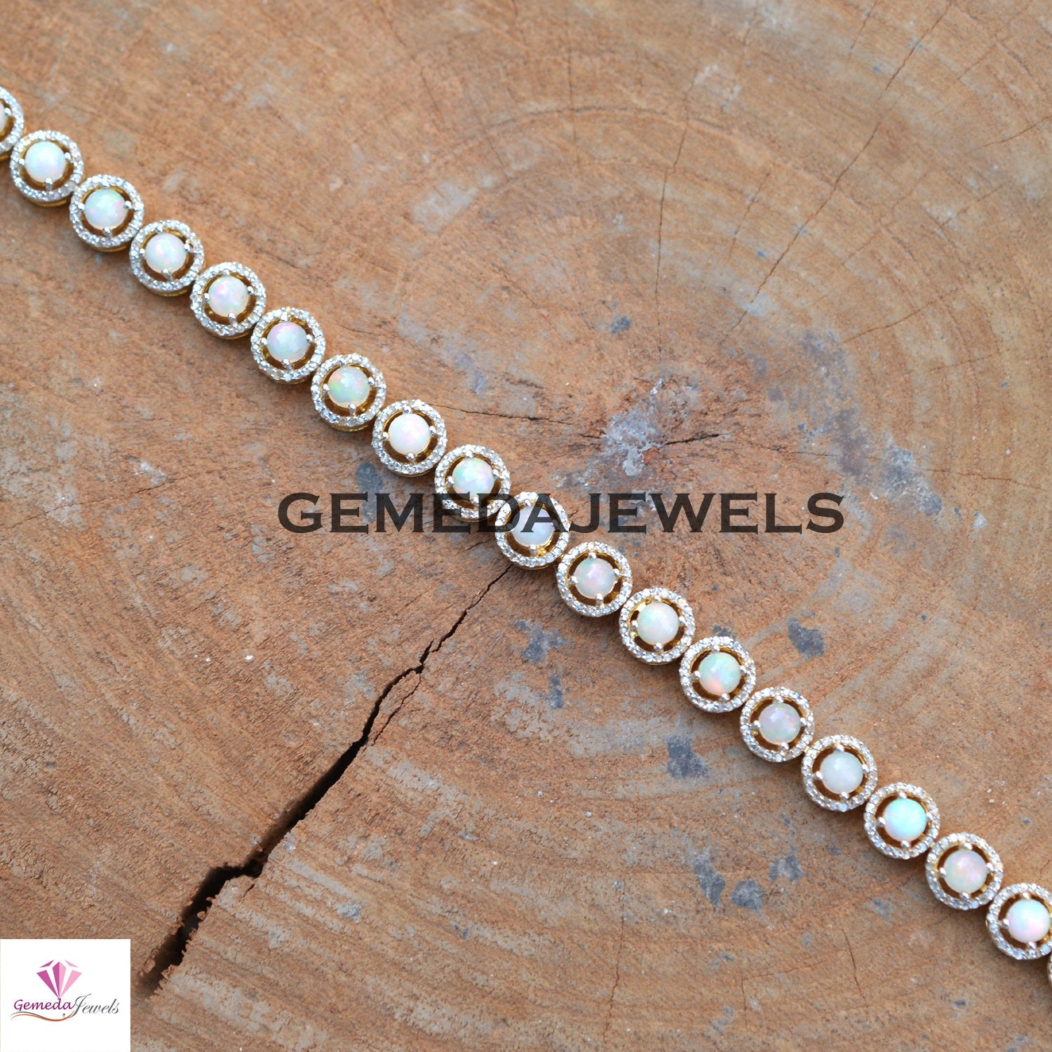 Classic Opal Gemstone Bracelet, 925 Silver Jewelry, 14k Gold Plated Bracelet, Pave Diamond Bracelet, Gemstone Silver Jewelry, 8" Bracelet