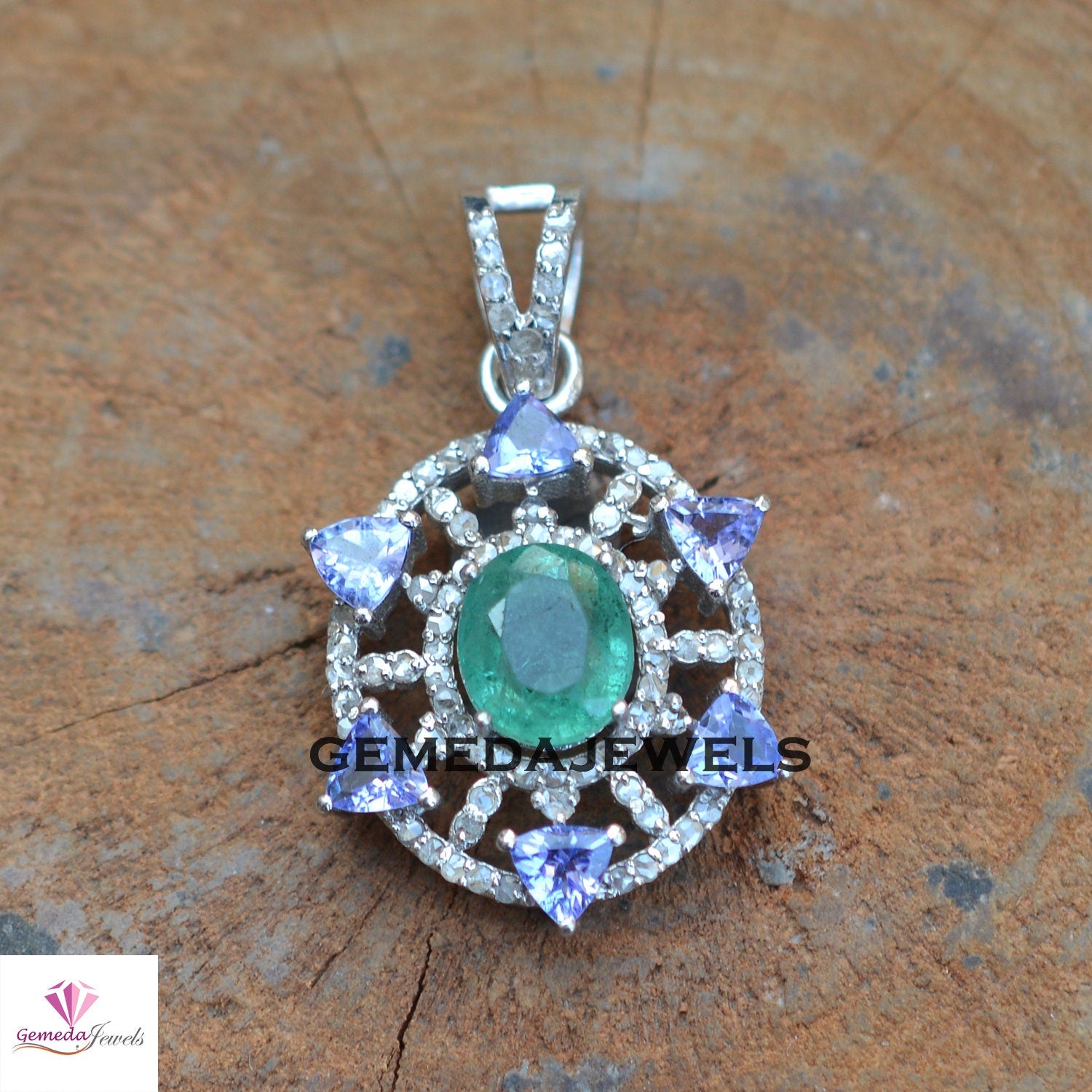 Genuine Emerald Pendant, Tanzanite Gemstone Jewelry, Pave Diamond Pendant, 925 Sterling Silver Jewelry, 16" Link Chain Pendant Necklace Gift