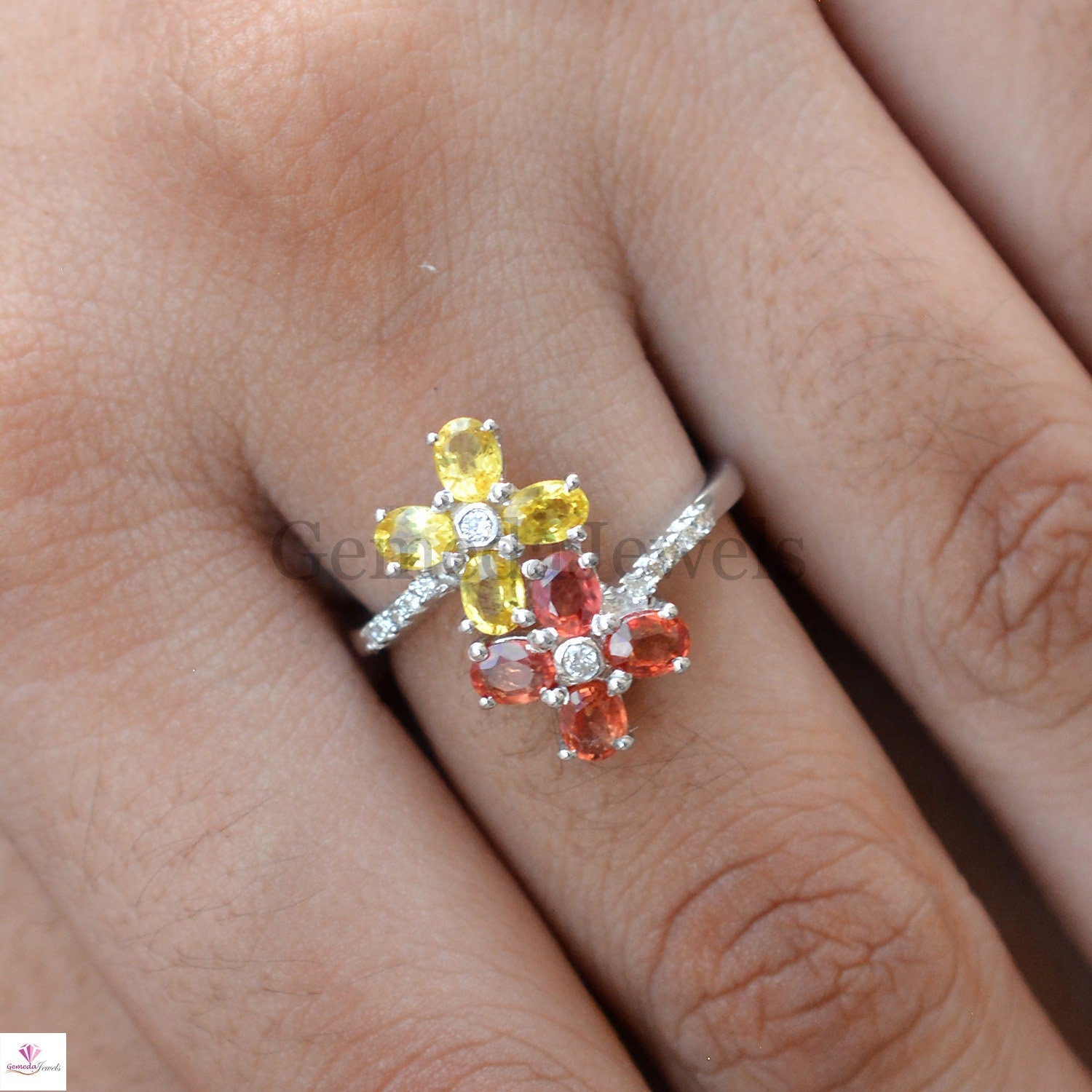 Genuine Multi Sapphire Diamond Ring, Flower Gemstone Ring, Pave Diamond Jewelry, Sterling Silver Jewelry, Minimalist Ring, Anniversary Gift