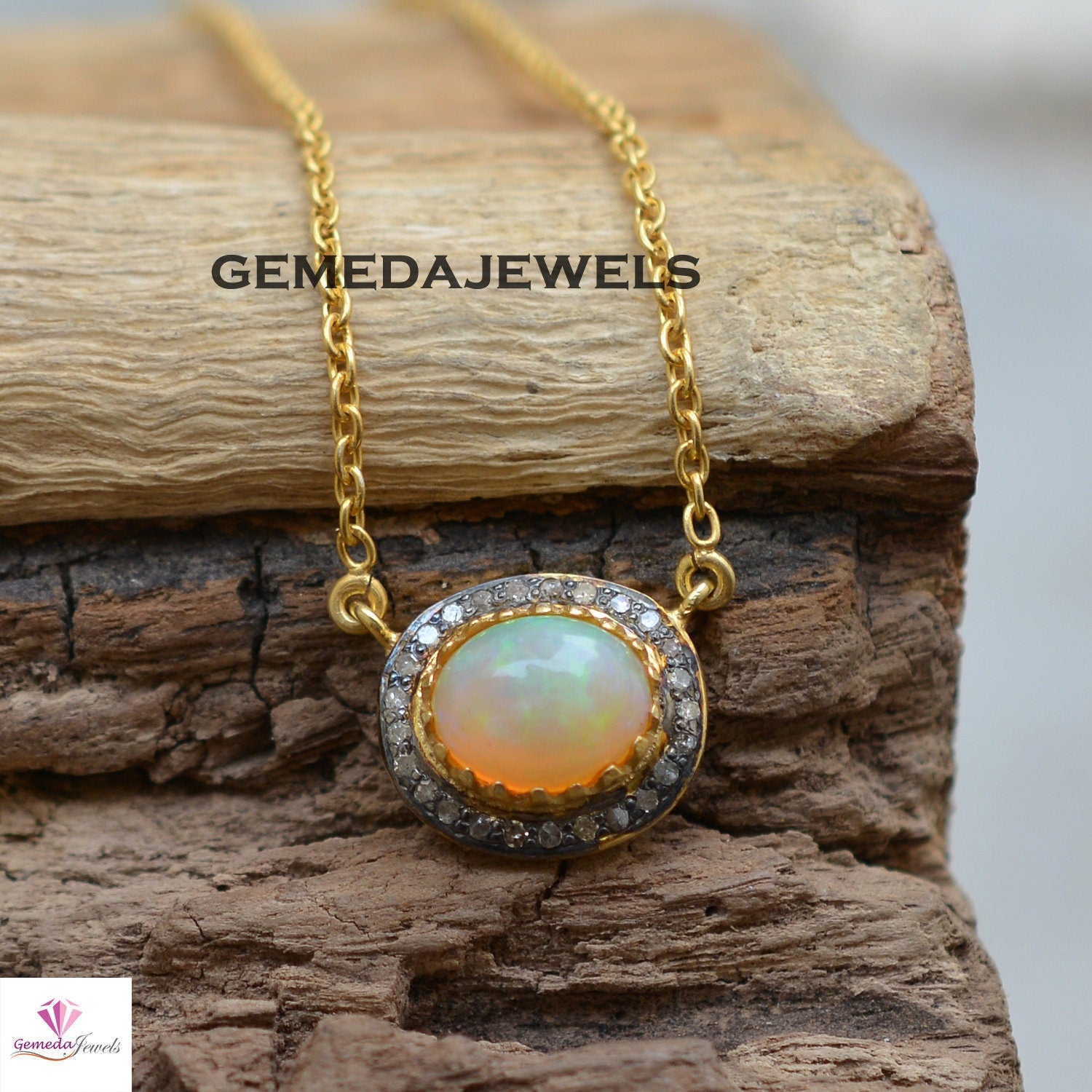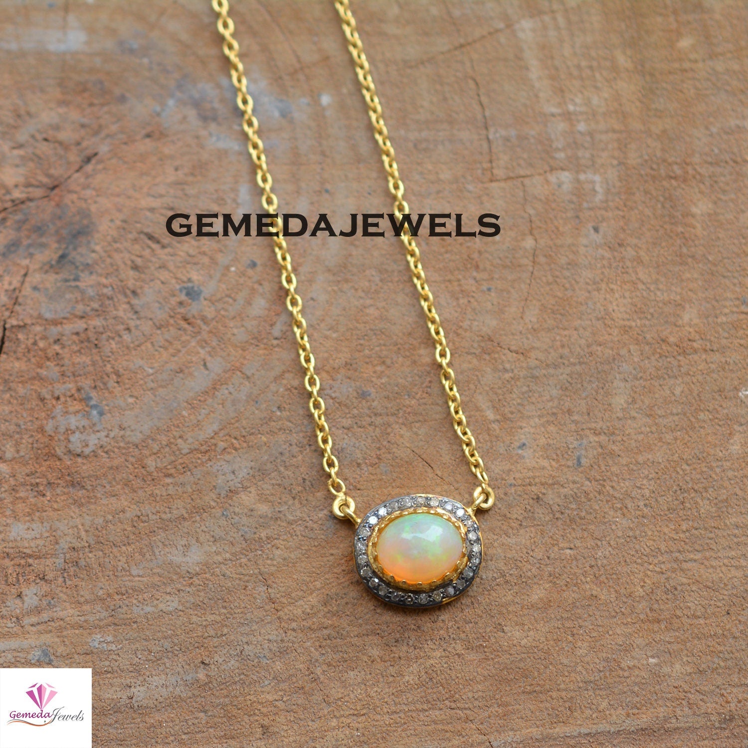 Genuine Opal Gemstone Charm Pendant, 925 Silver Pendant, Pave Diamond Jewelry, 14k Gold Plated 18" Link Chain Necklace, Gemstone Jewelry