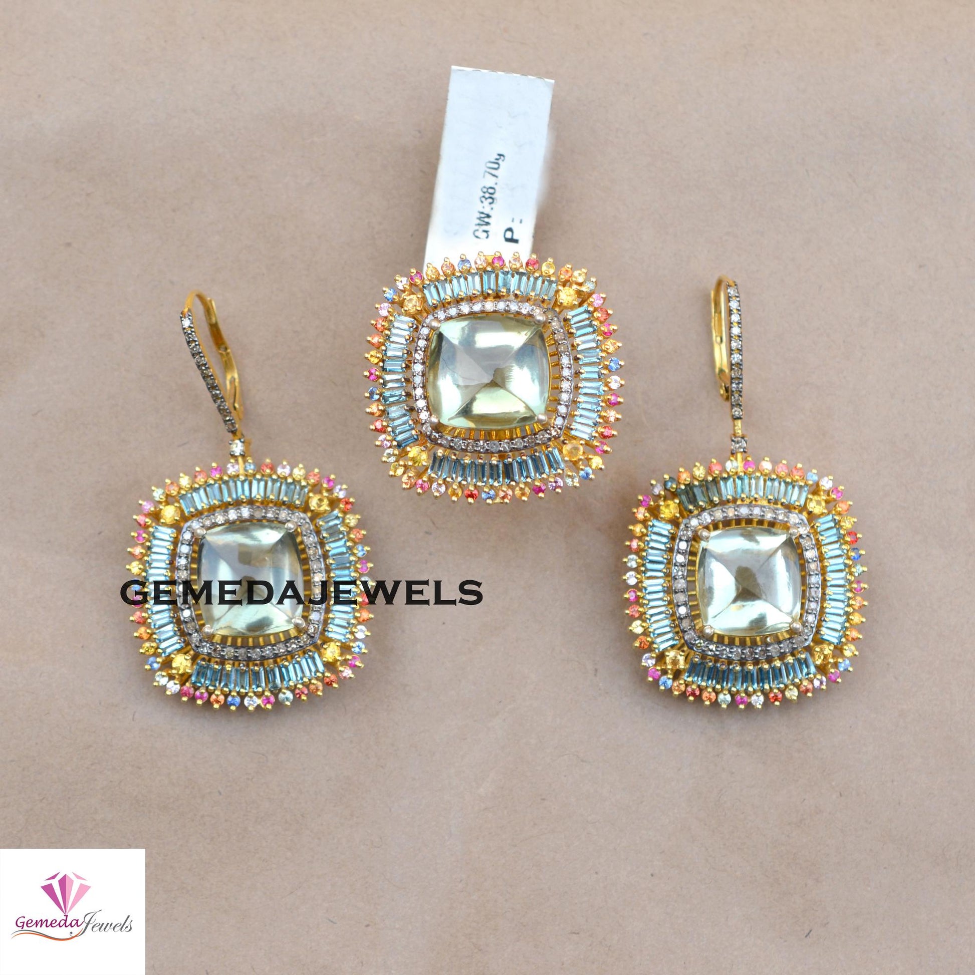Multi Color Gemstone Jewelry Set, Green Gemstone Jewelry, Pave Diamond Jewelry Sets, 925 Silver Ring Earrings Set, Pave Diamond Jewellery