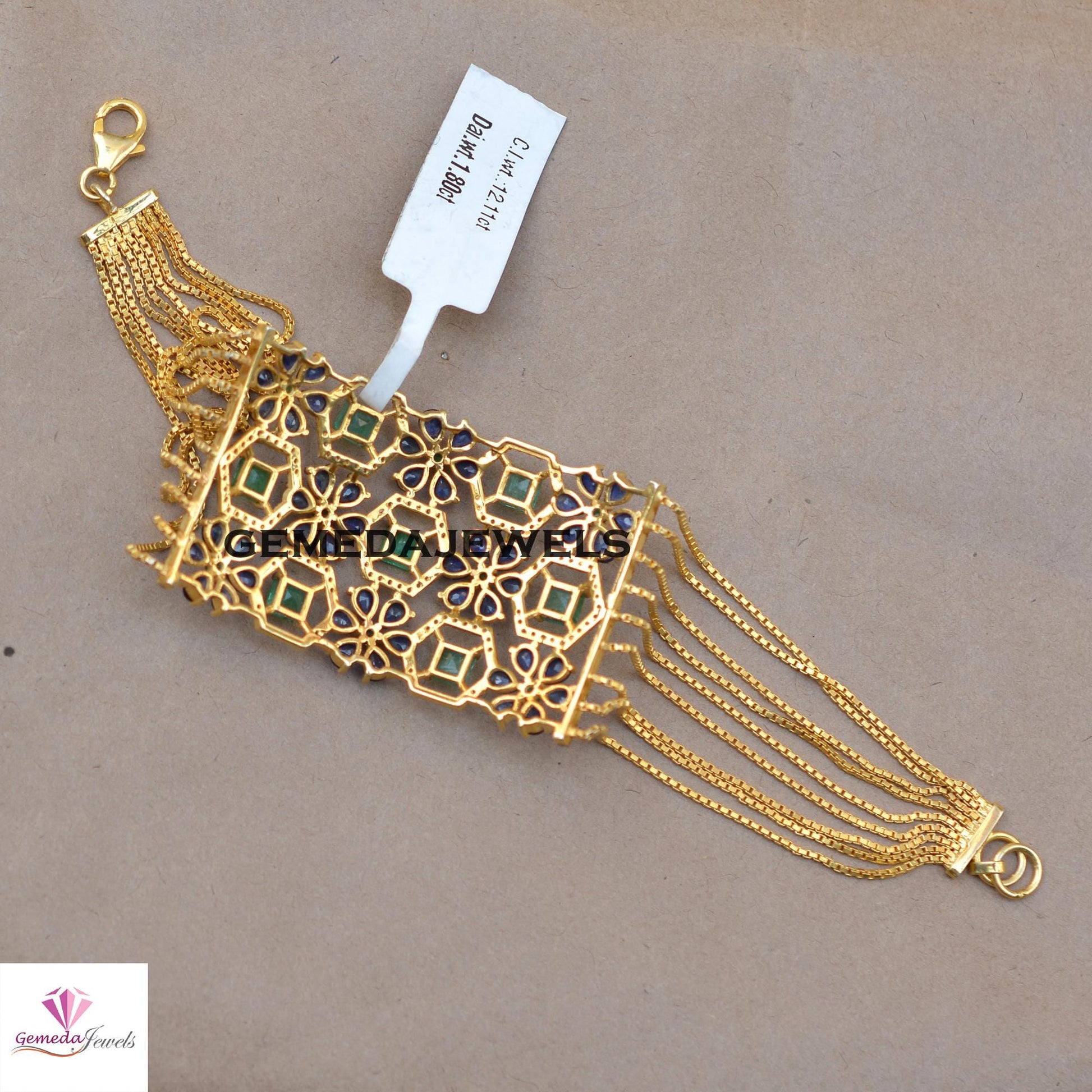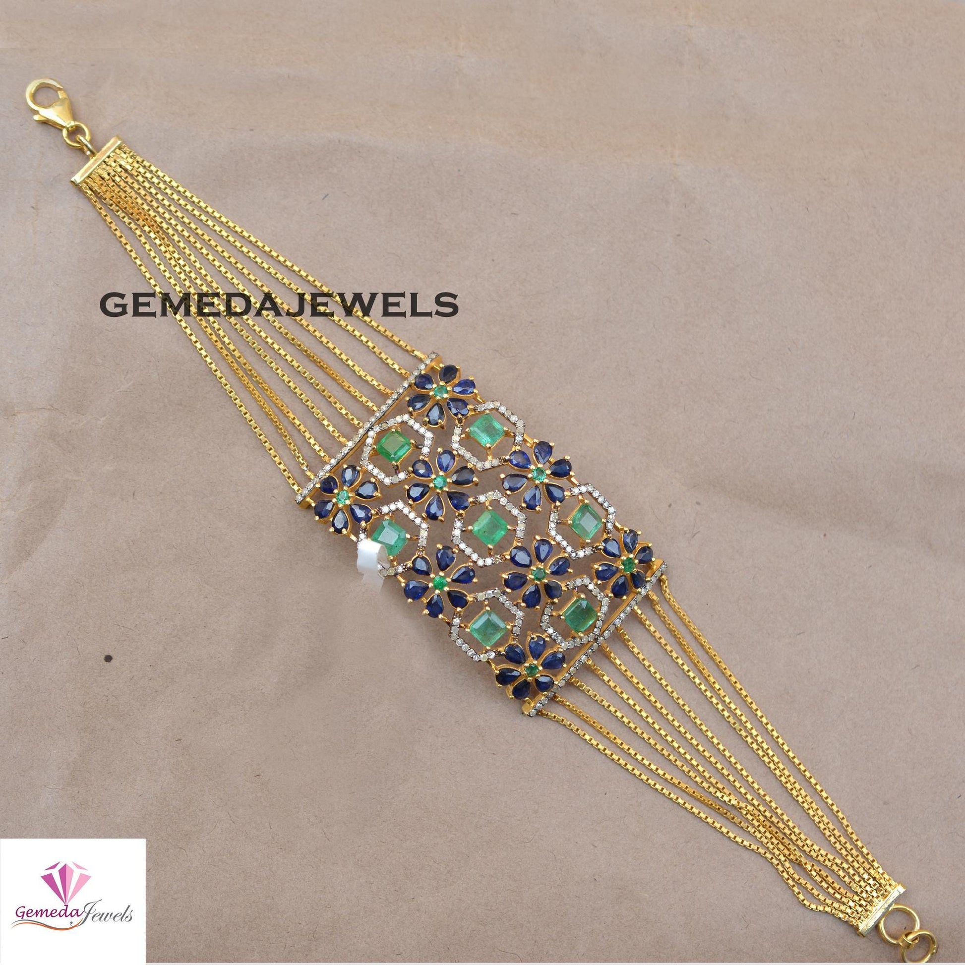 Natural Emerald Bracelet, Sapphire Flower Bracelet, 925 Silver Gold Plated Link Chain Clasp Lock Bracelet, Pave Diamond Jewelry Wedding Gift