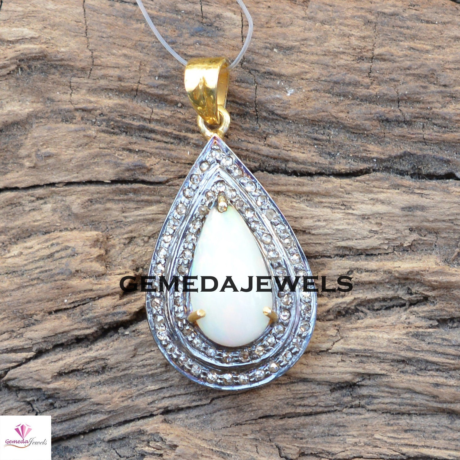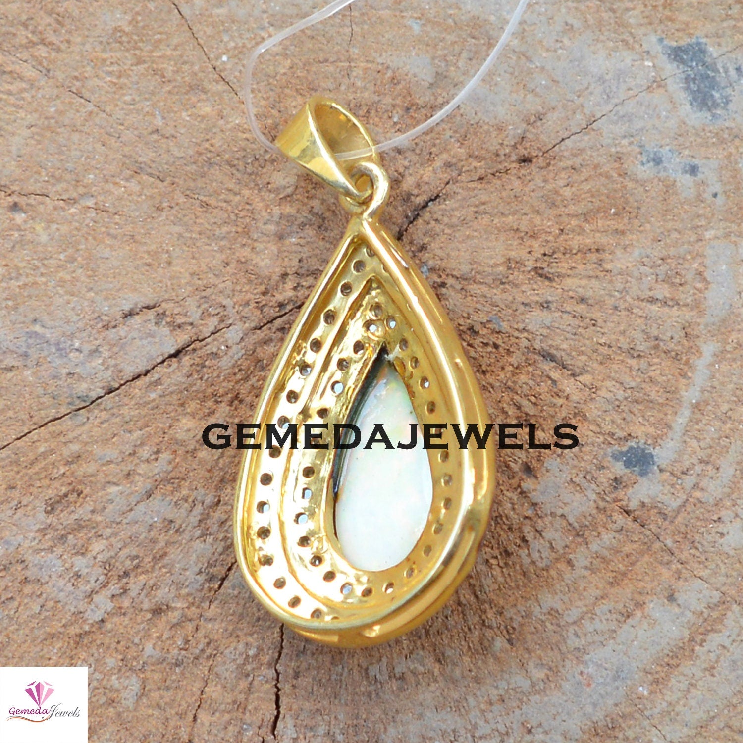 Natural Opal Pendant, Pave Diamond Jewelry, Gemstone Silver Pendant, 925 Silver Jewelry, Gold Plated Pendant, 16" Chain Necklace Jewellery