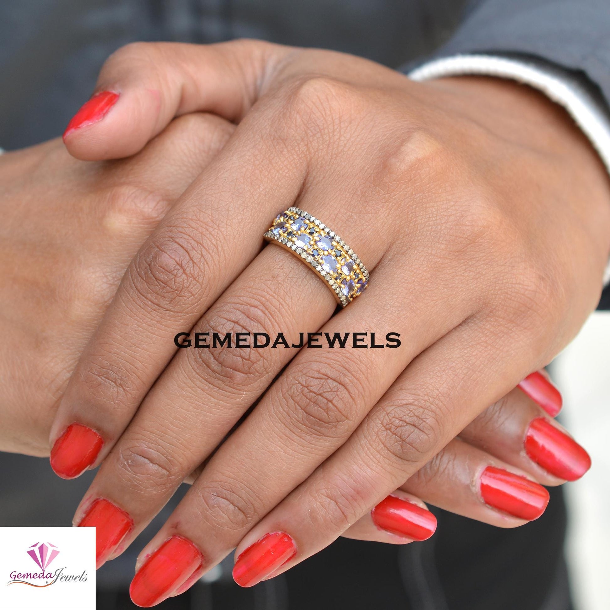 Natural Tanzanite Gemstone Ring, Sapphire Band Ring Jewelry, Pave Diamond Ring, Solid 925 Silver Jewelry, 14k Gold Plated Jewelry, Gift
