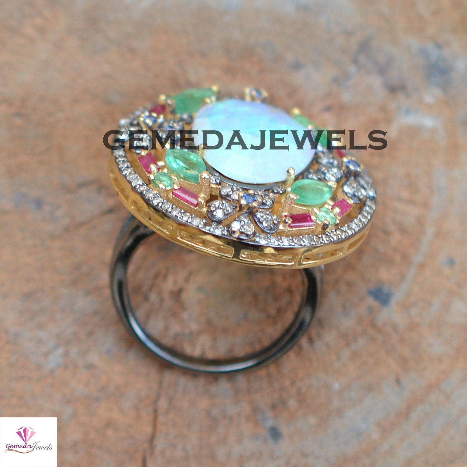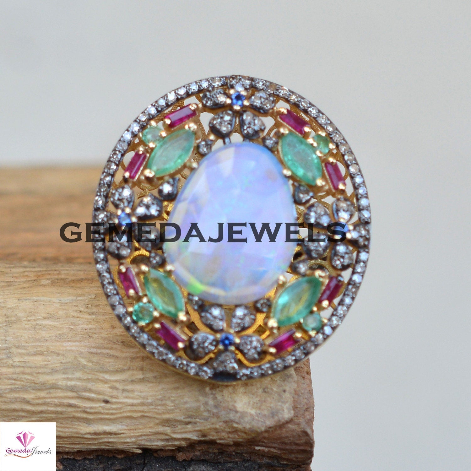 Opal Slice Gemstone Ring, Diamond Flower 925 Silver Ring, Emerald Gemstone Jewelry, 14k Gold Vermeil Ring, Ruby Gemstone Ring, Gifts For Her