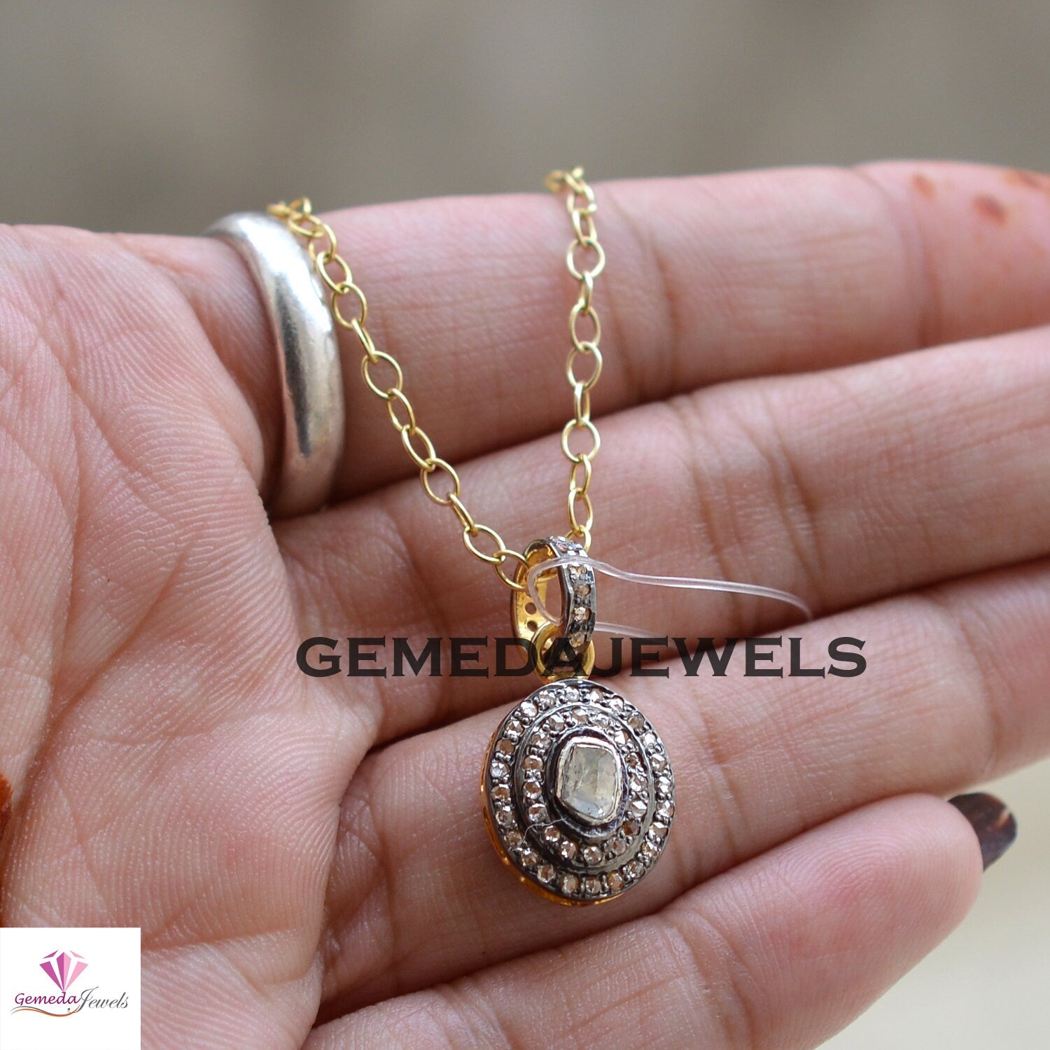 Oval Shape Polki Diamond Pendant, 925 Sterling Silver Jewelry, Pave Silver Gold Plated Jewelry, 16" Silver Link Chain Pendant, Gift For Her