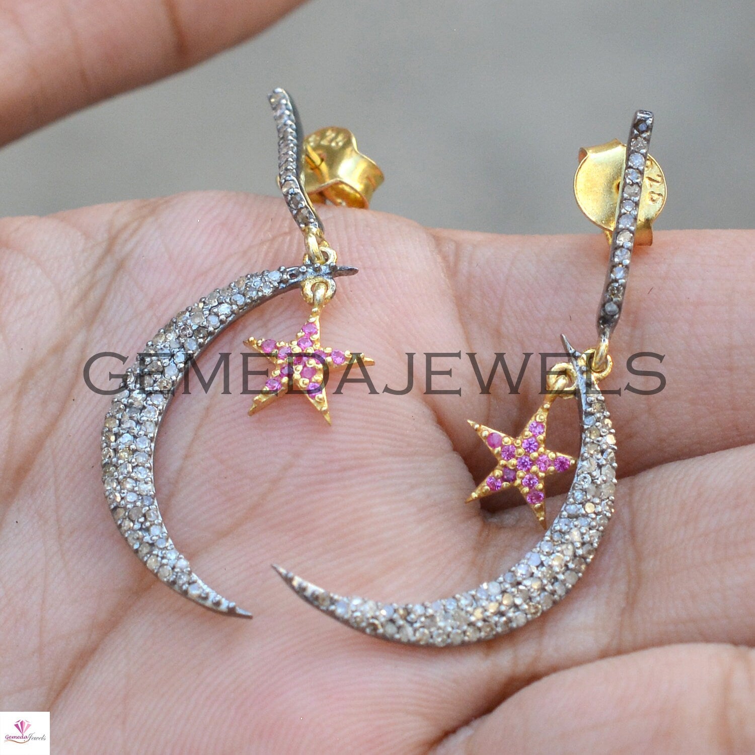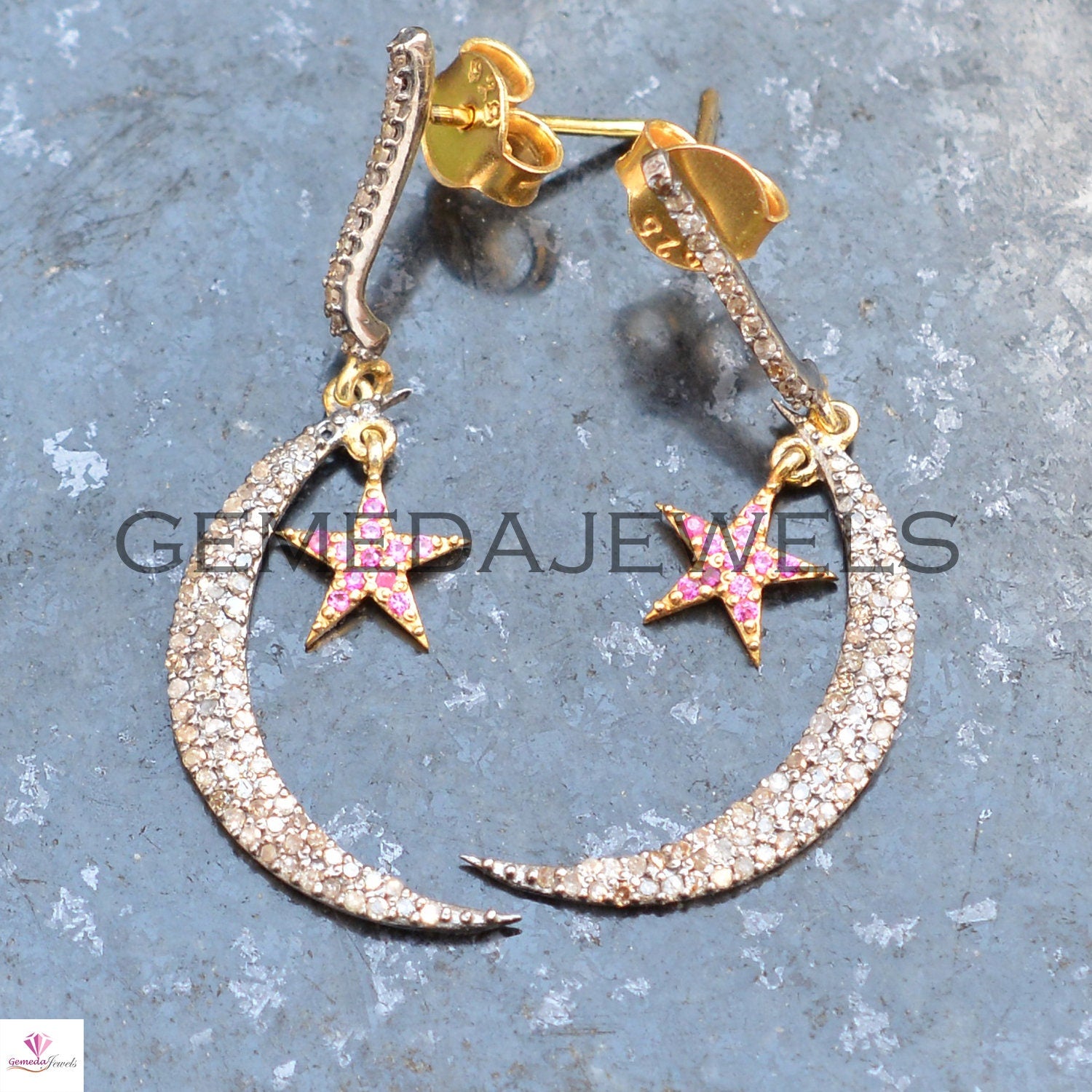 Pave Diamond Crescent Moon Earrings, 925 Silver Gold Jewelry, Ruby Gemstone Star Earrings, Handmade Earrings, Gift For her, Bridesmaid Gift