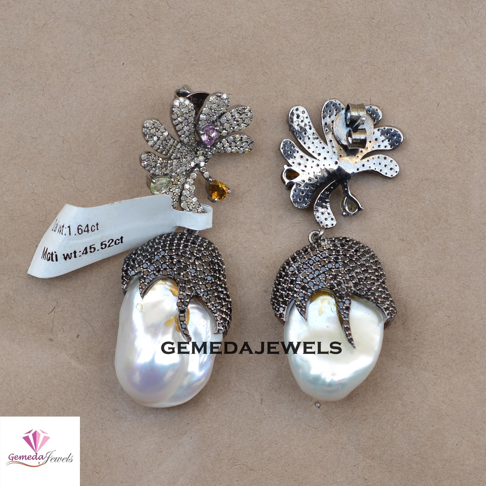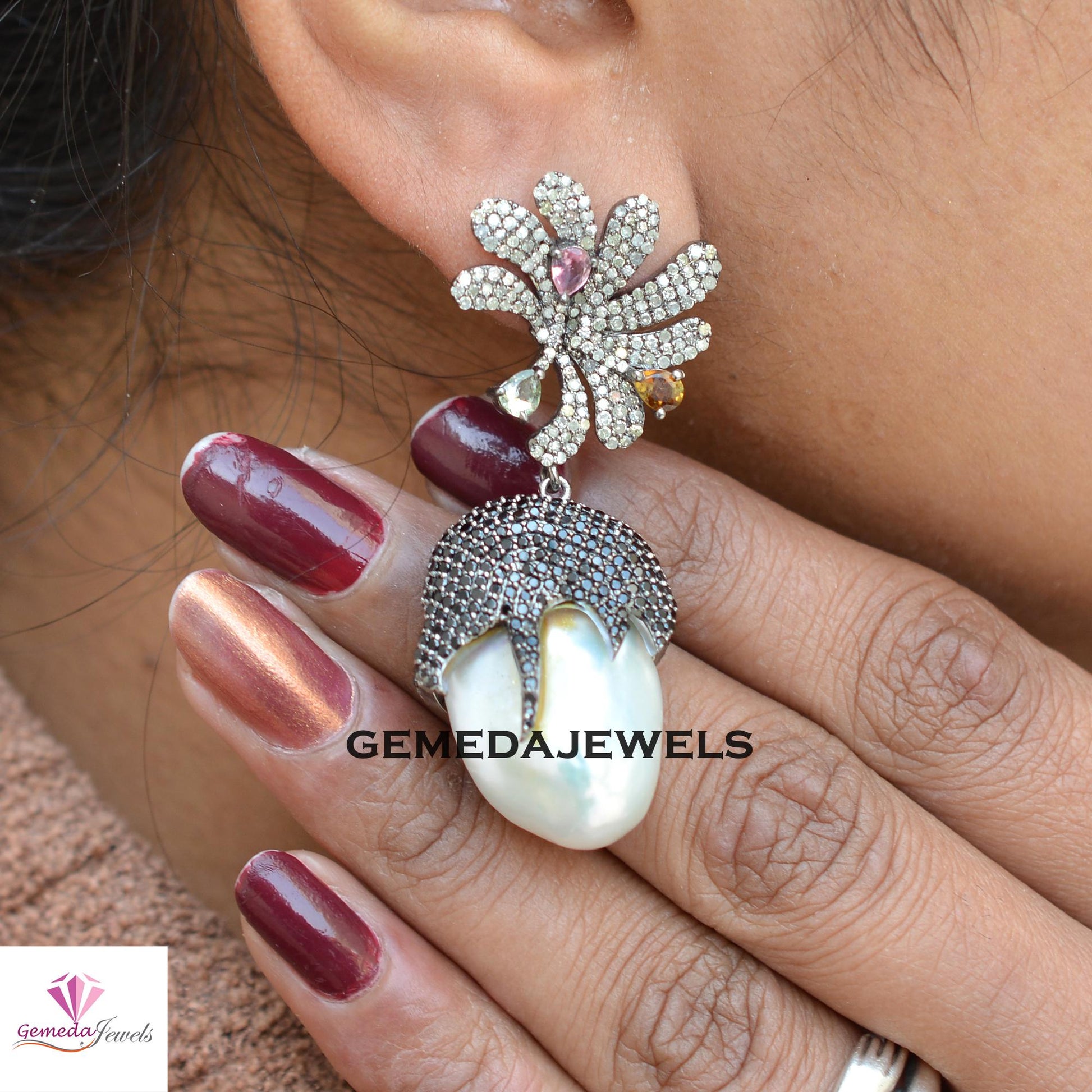 Pearl Earrings, Black Spinel Gemstone Jewelry, Multi Tourmaline Gemstone, 925 Silver Jewelry, Women's Gift Jewelry, Pave Diamond Earrings