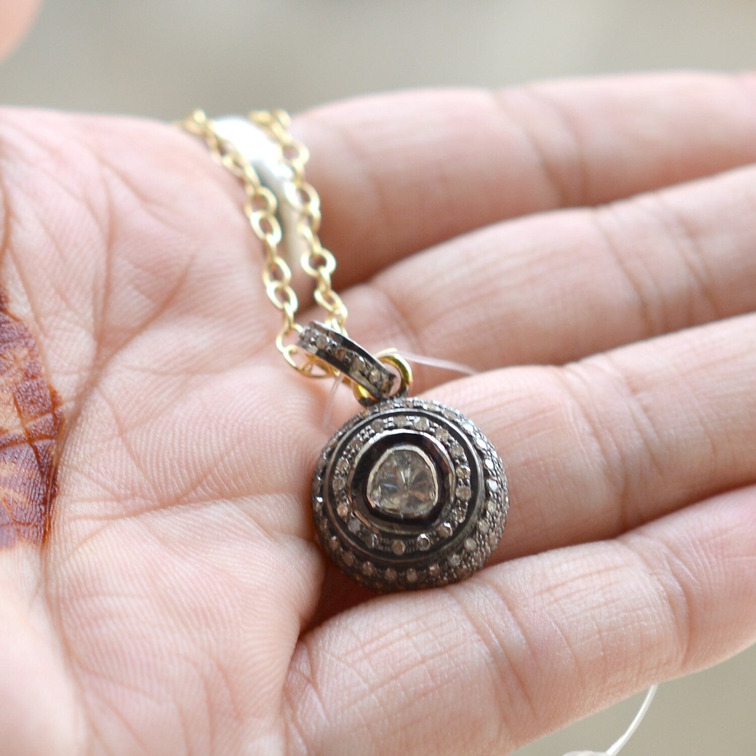 Polki Diamond Pendant, 14k Gold Plated Jewelry, Pave 925 Silver Pendant, Round Shape Pendant, 16" Silver Link Chain Necklace Pendant, Gift
