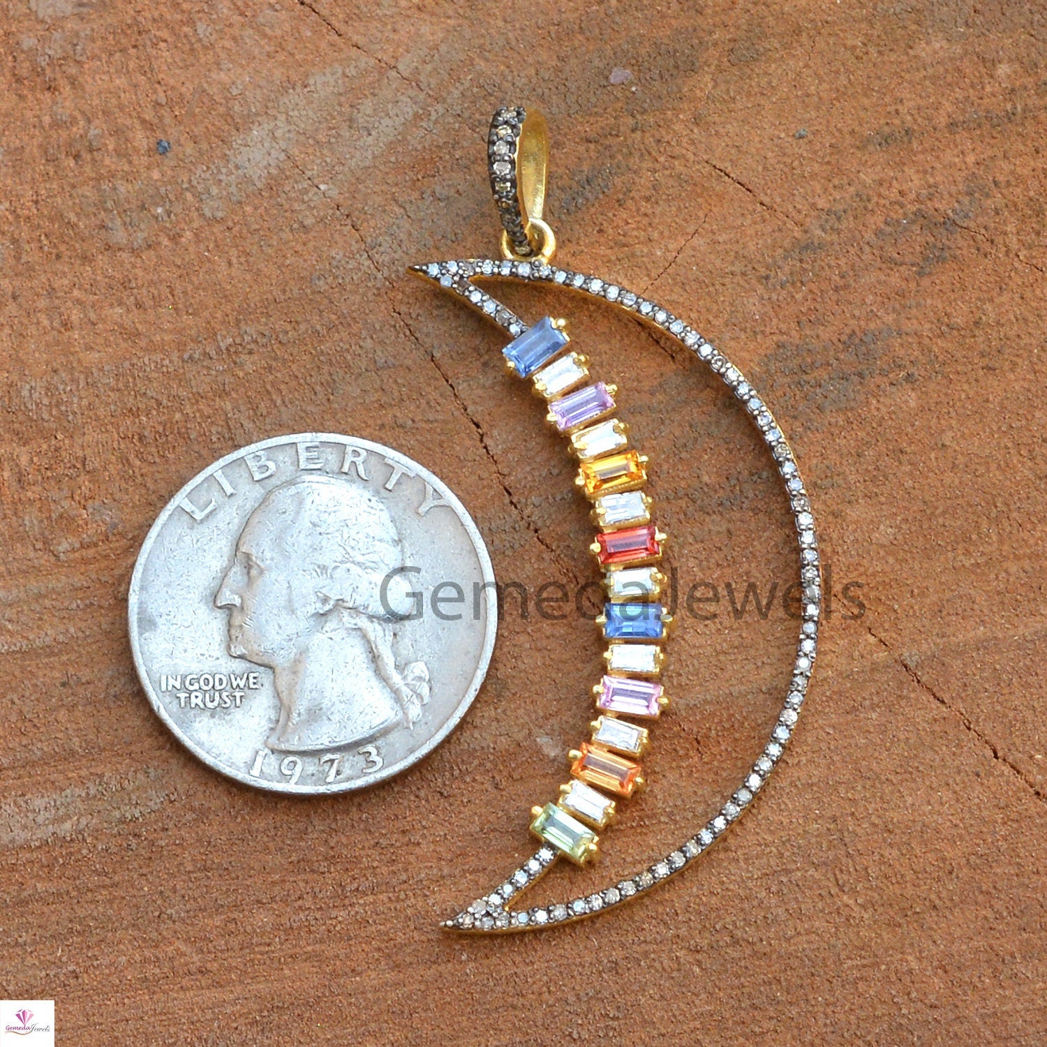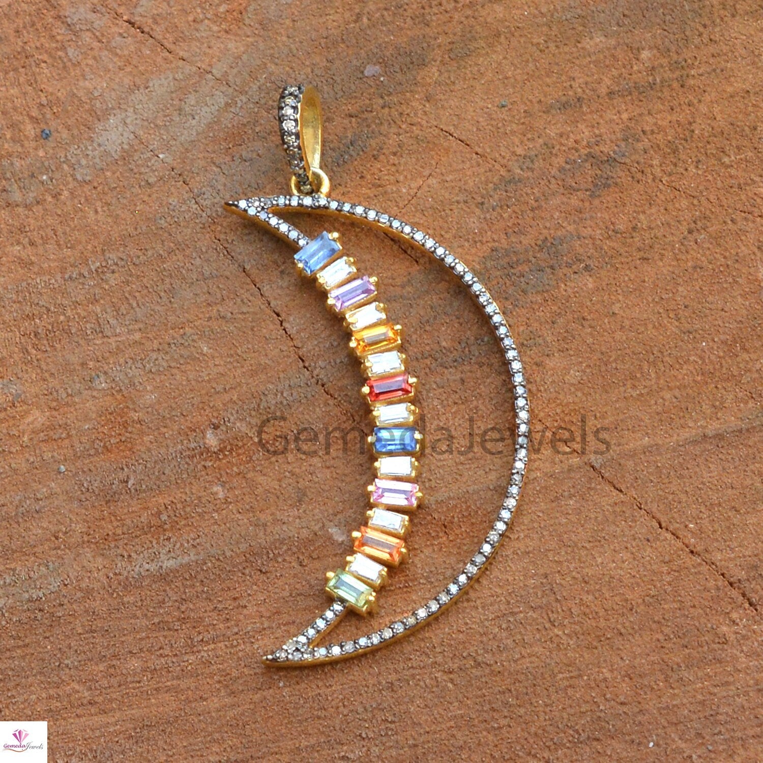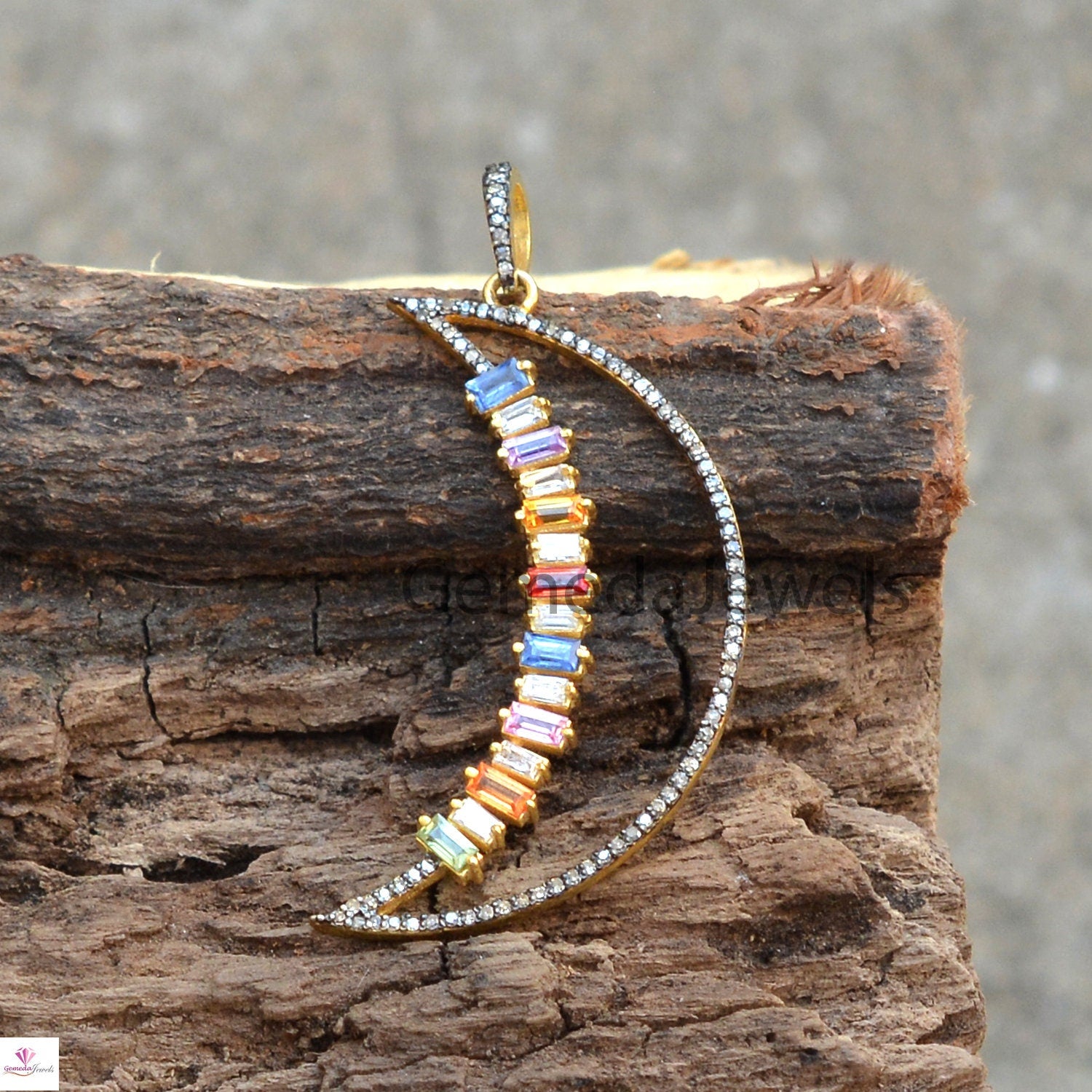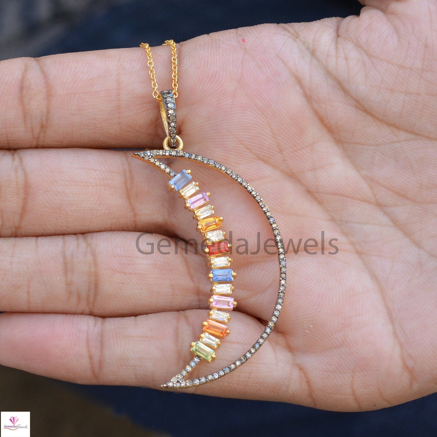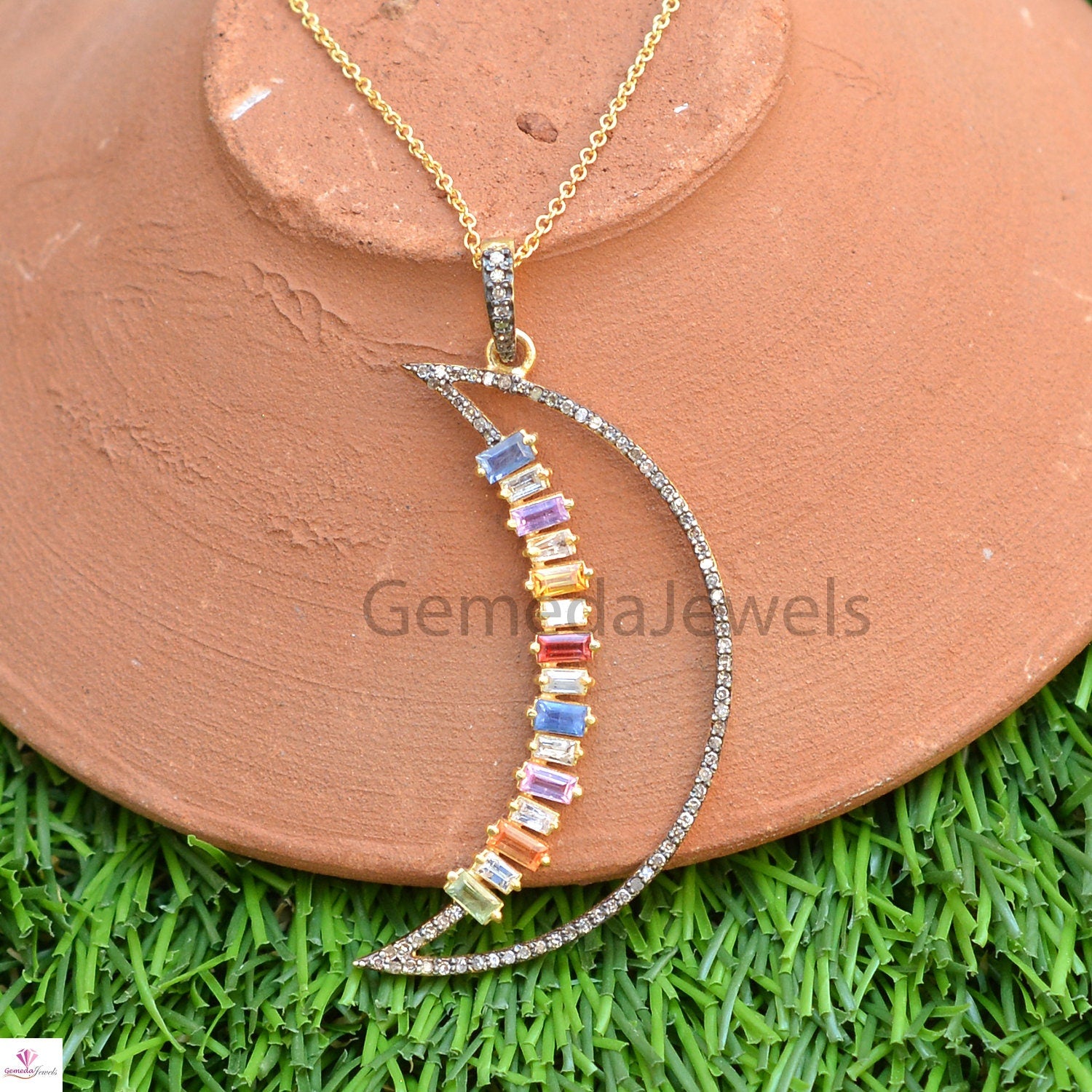 Real Multi Sapphire Pendant, Crescent Moon Pendant, 925 Silver Jewelry, Gold Vermeil Jewelry, Pave Diamond Pendant 16" Link Chain Necklace Pendant