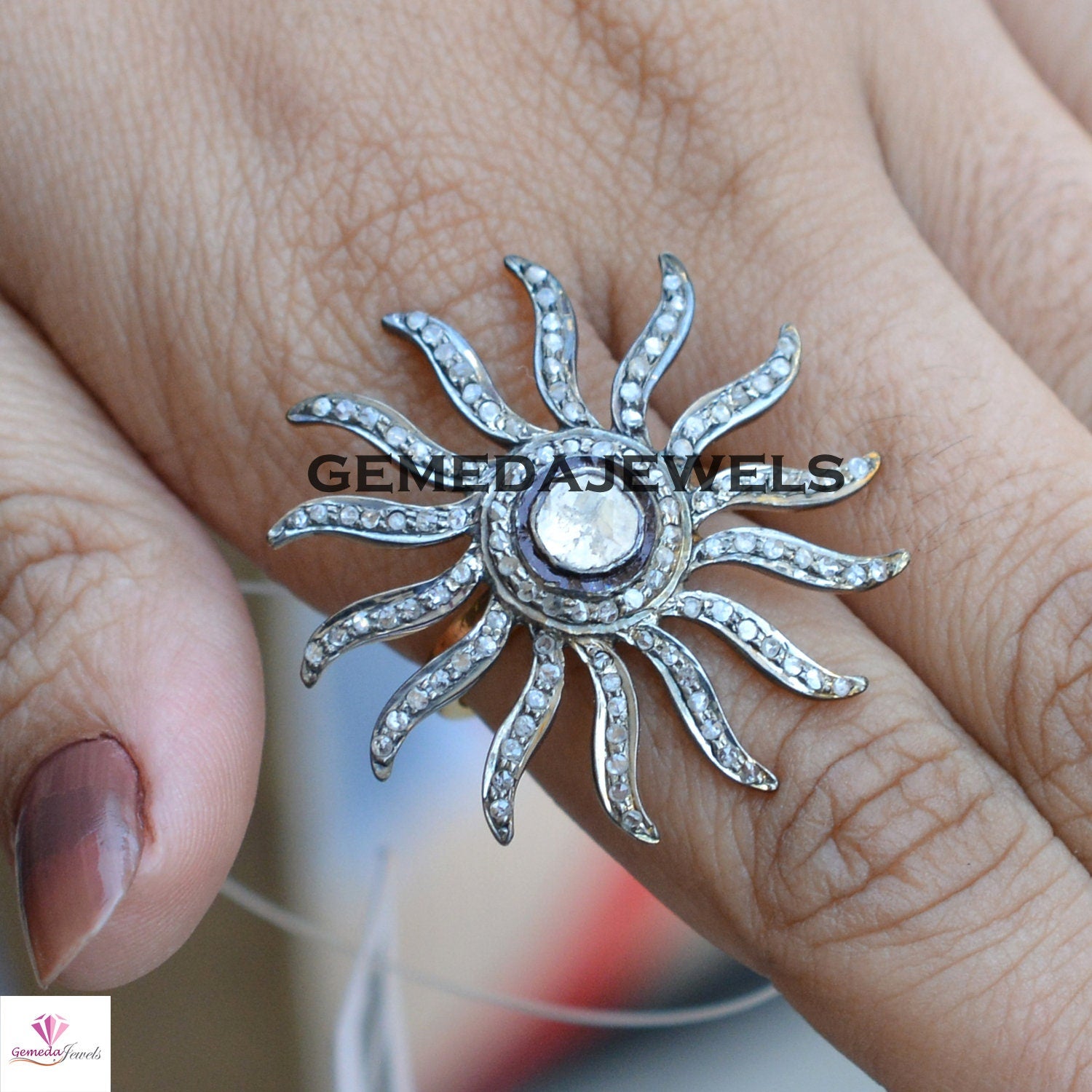 Polki Diamond Sun Ring, Sterling Silver Ring, Diamond Silver Jewelry, Gold Filled Sun Ring, Sun Flower Pave Diamond Ring, Engagement Ring