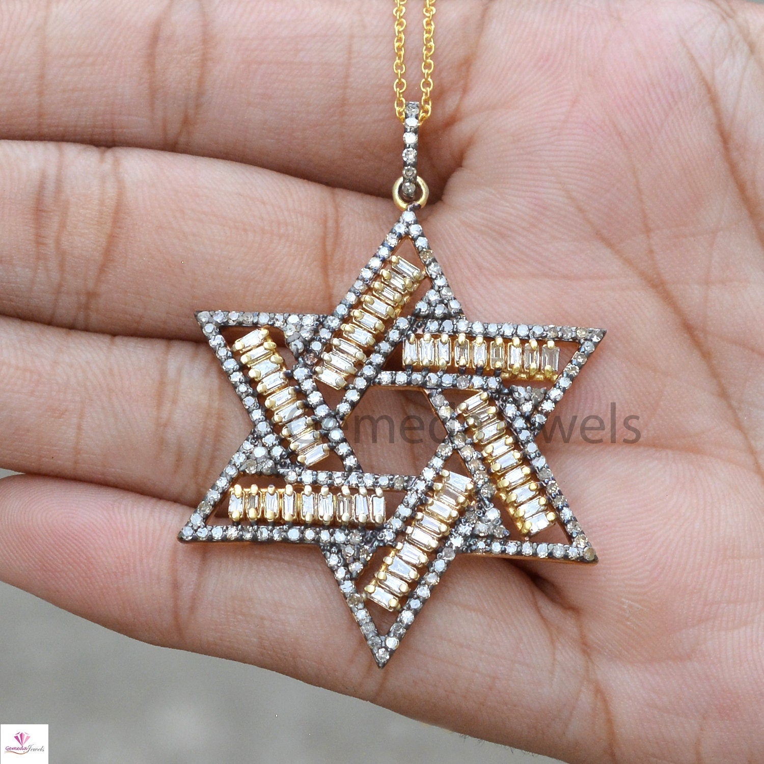 Sale Baguette Diamond Star Pendant, Pave Diamond Handmade Jewelry, 925 Silver Pendant, Star of David Pendant Necklace, 16" Link Chain, Gifts