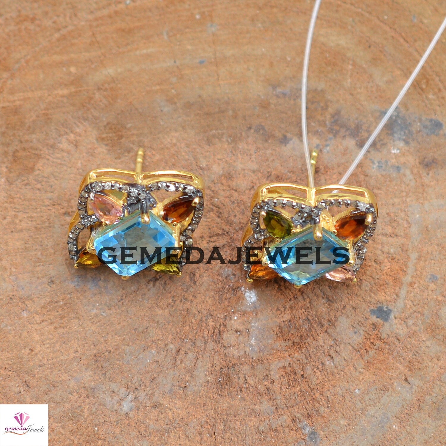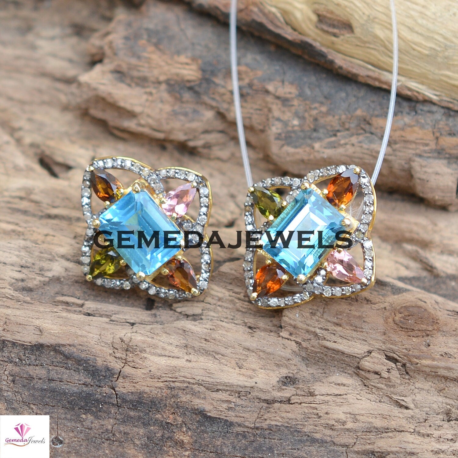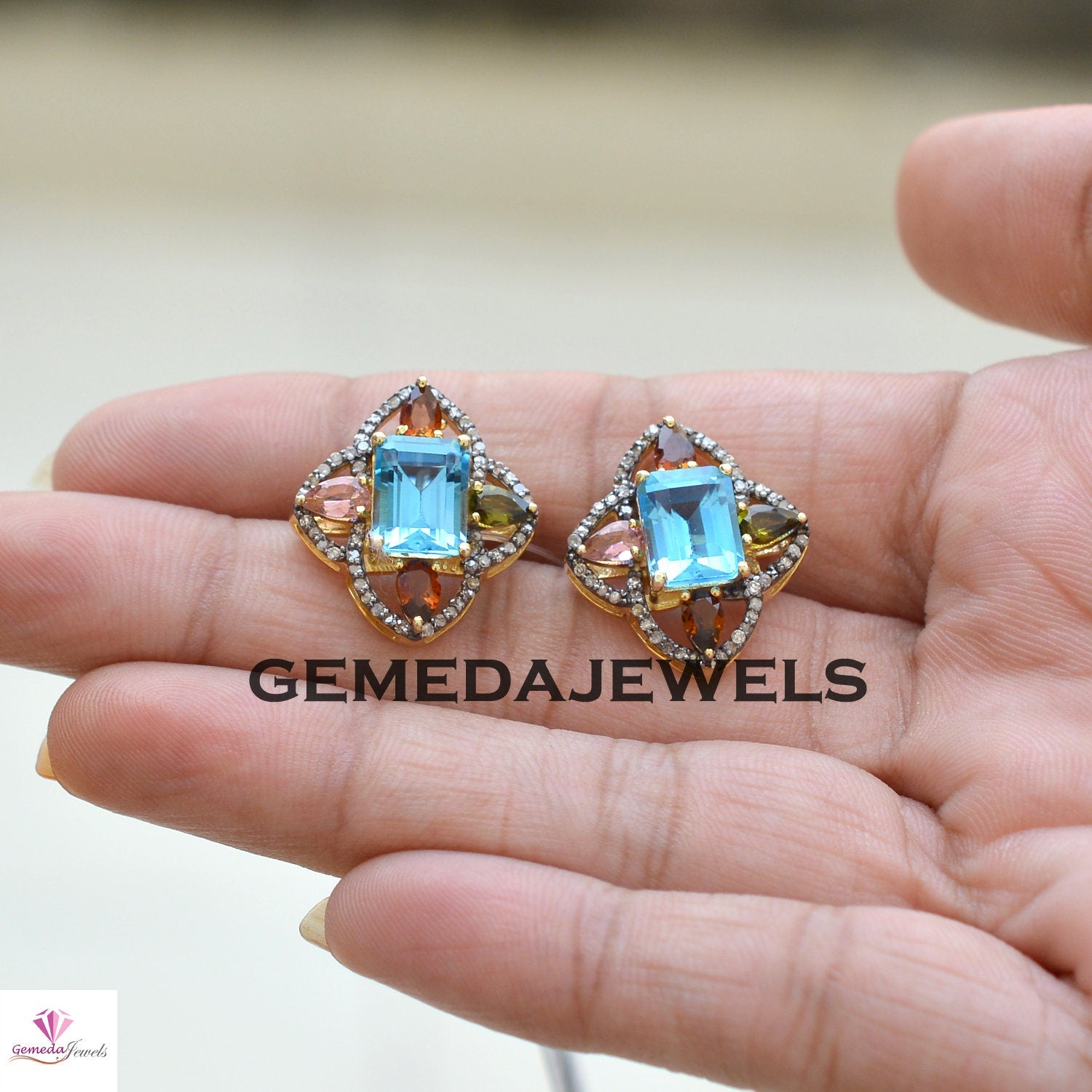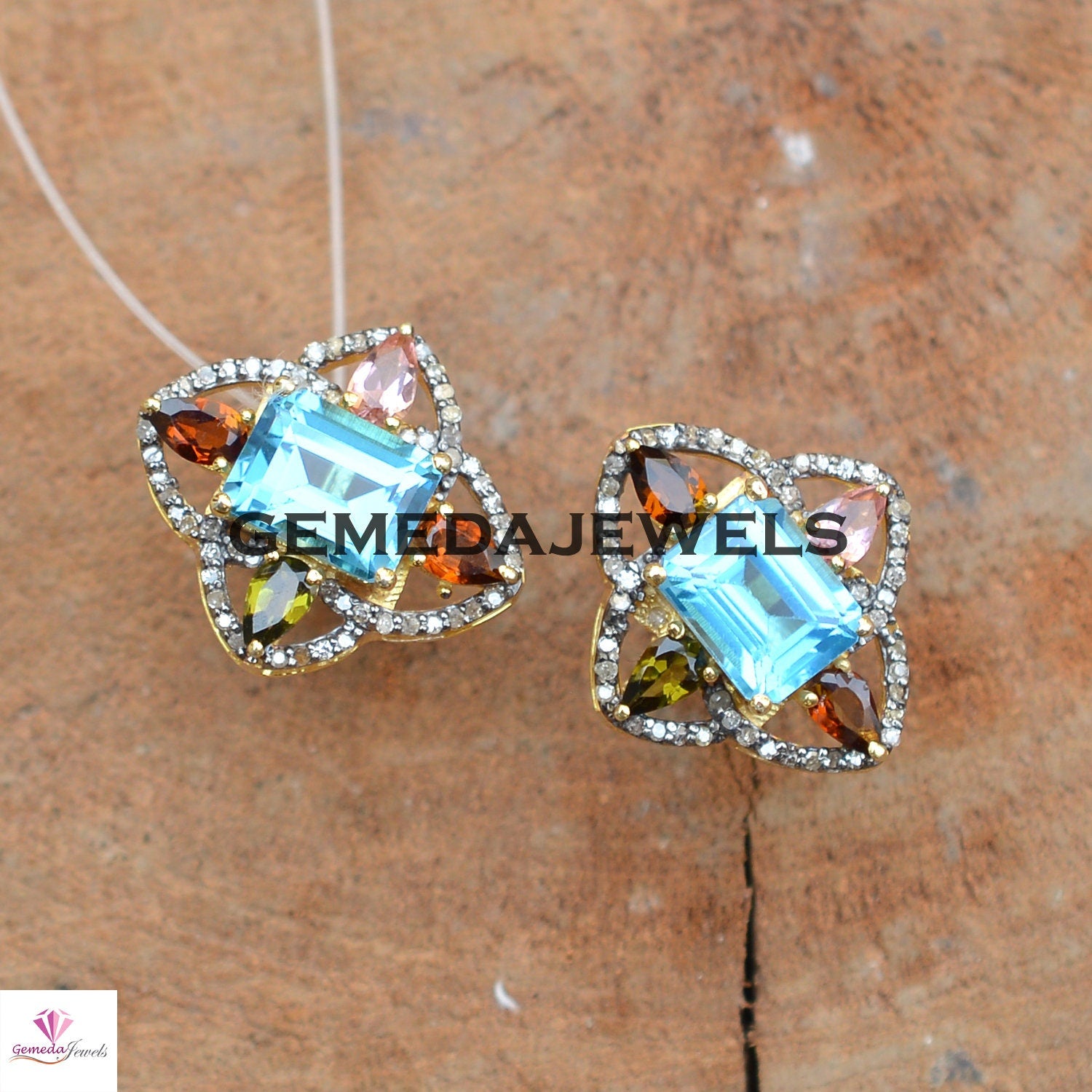 Sale! Blue Topaz Flower Stud Earrings, Pave Diamond Earrings, Multi Gemstone Jewelry, Yellow Vermeil 925 Silver Earrings, Women's Gift Jewelry