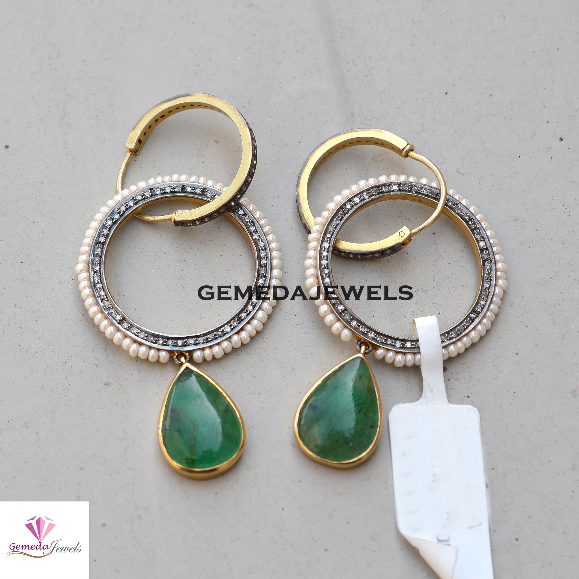 Sale! Classic Emerald Gemstone Earrings, TWO IN-ONE Earrings, Pearl Gemstone Jewelry, Pave Diamond Earrings, Designer Earrings, Gift For Her