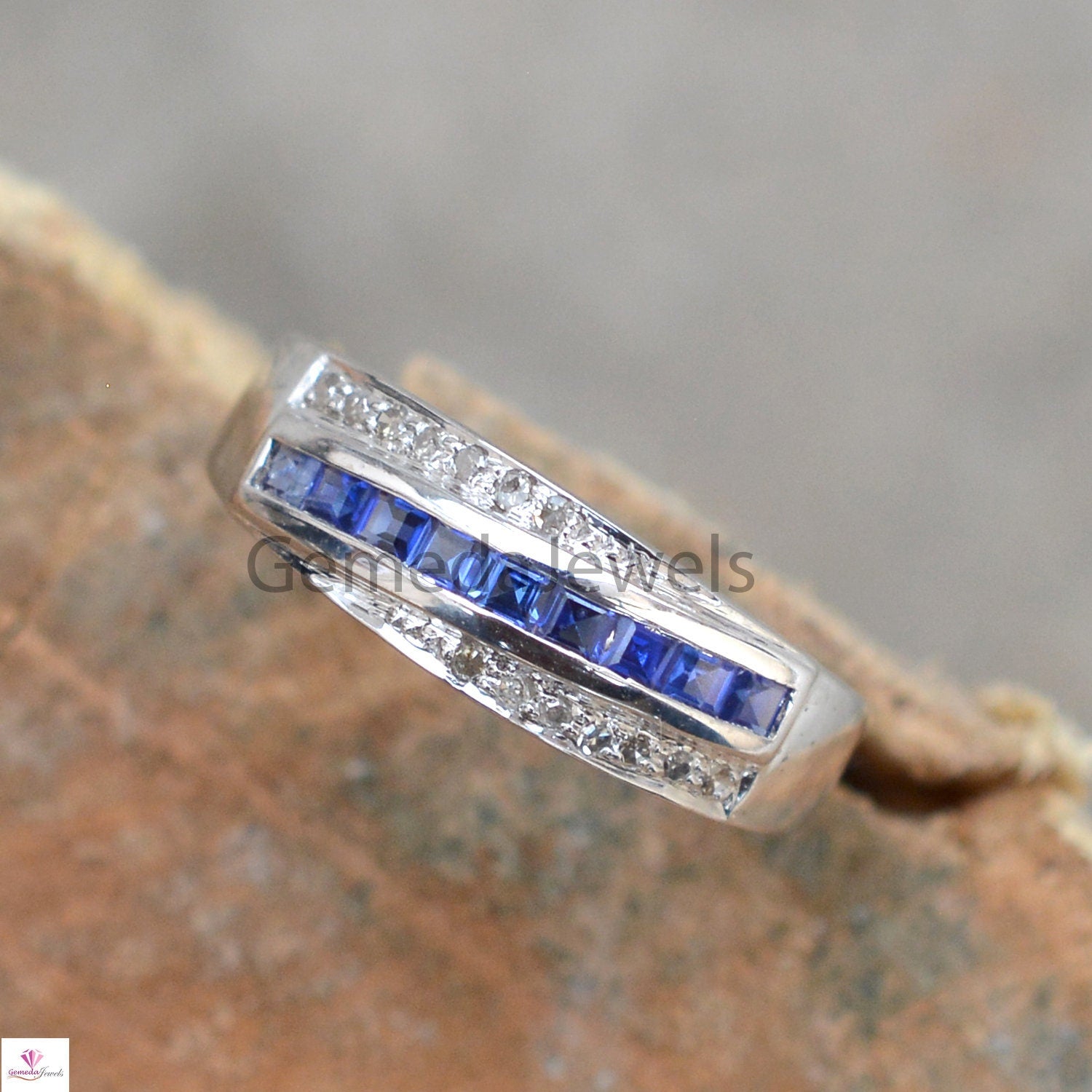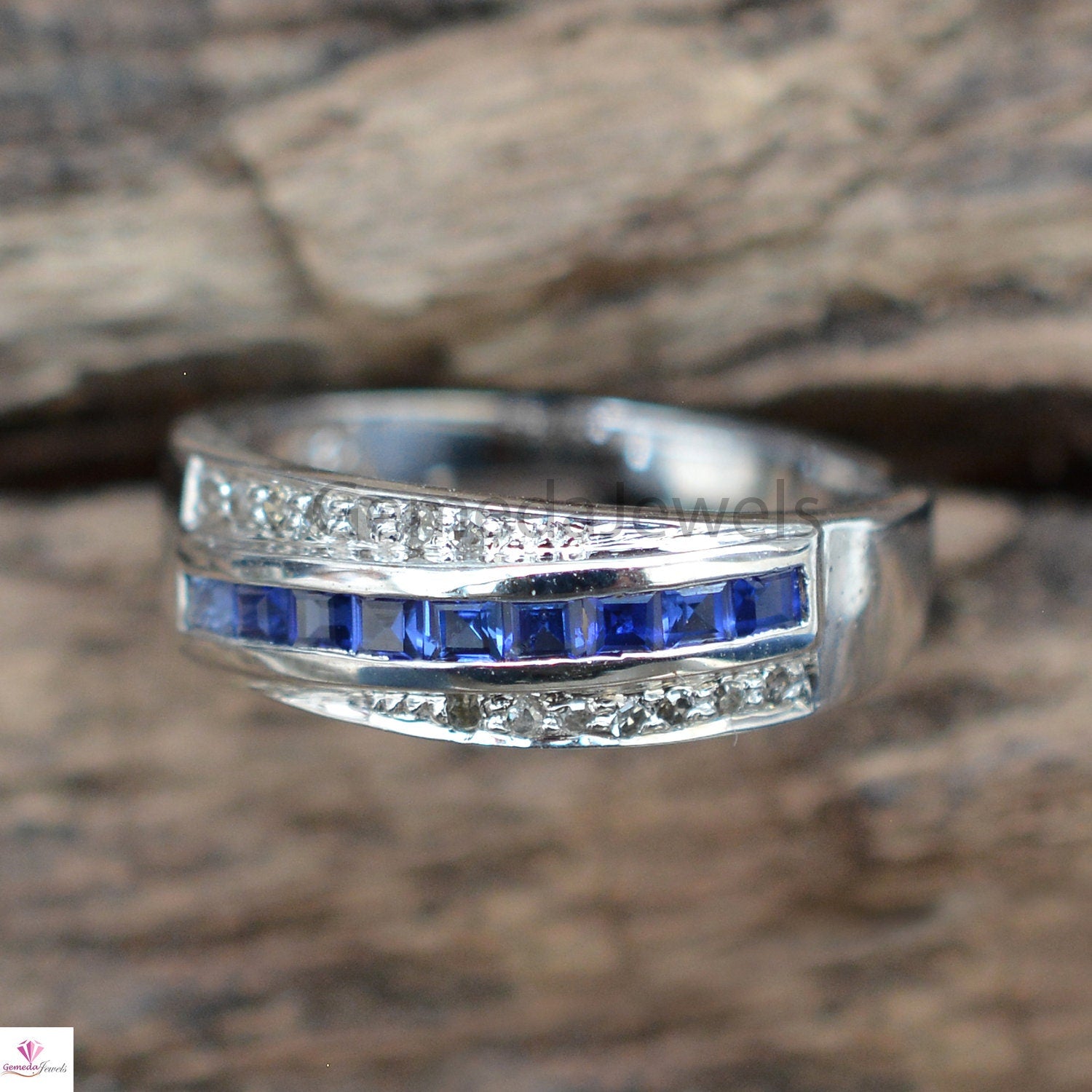 Genuine Blue Sapphire Band Ring, Sterling 925 Silver Jewelry, Pave Diamond Handmade Ring, Stacking Ring, Wedding Gift Ring, Gift For Her
