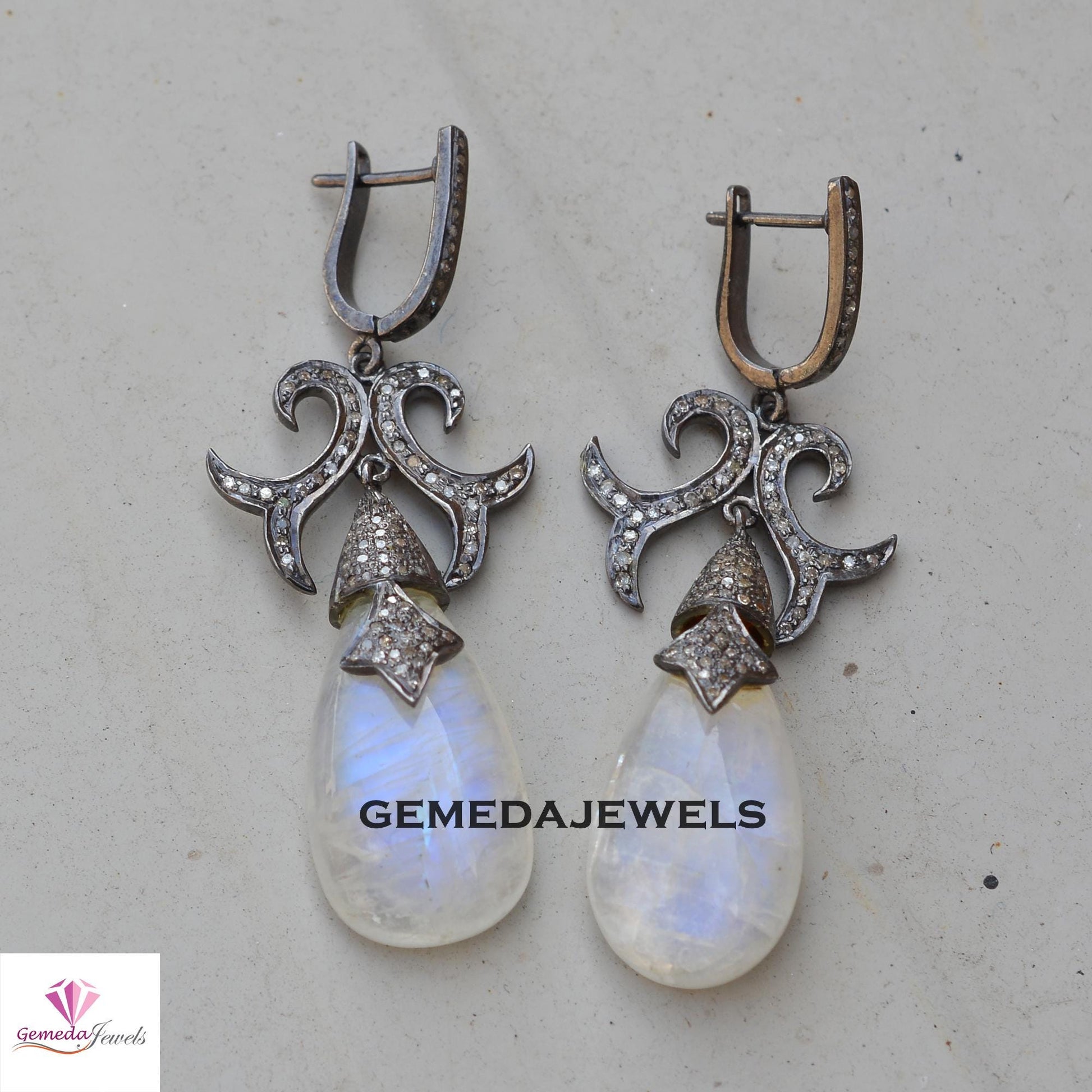 Sale!! Moonstone Gemstone Earrings, Pave Diamond Jewelry, Drop Dangle Designer Earring, Rhodium Plated 925 Silver Jewelry, Gift For Her