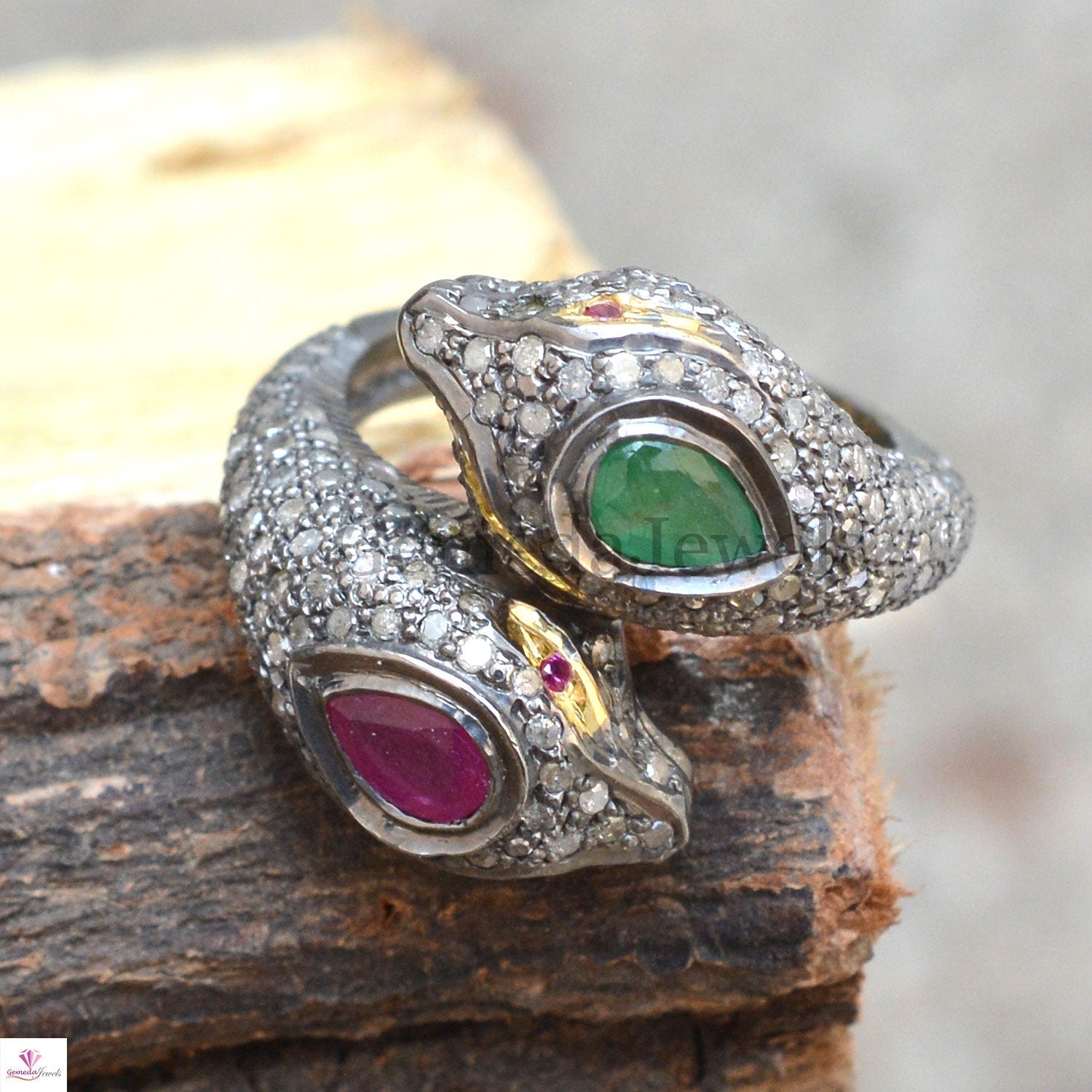 Sale! Natural Ruby Emerald Snake Ring, Pave Setting Diamond Jewelry, Red Eyes Diamond Silver Snake Jewelry, Gemstone Ring, Jewelry For Women