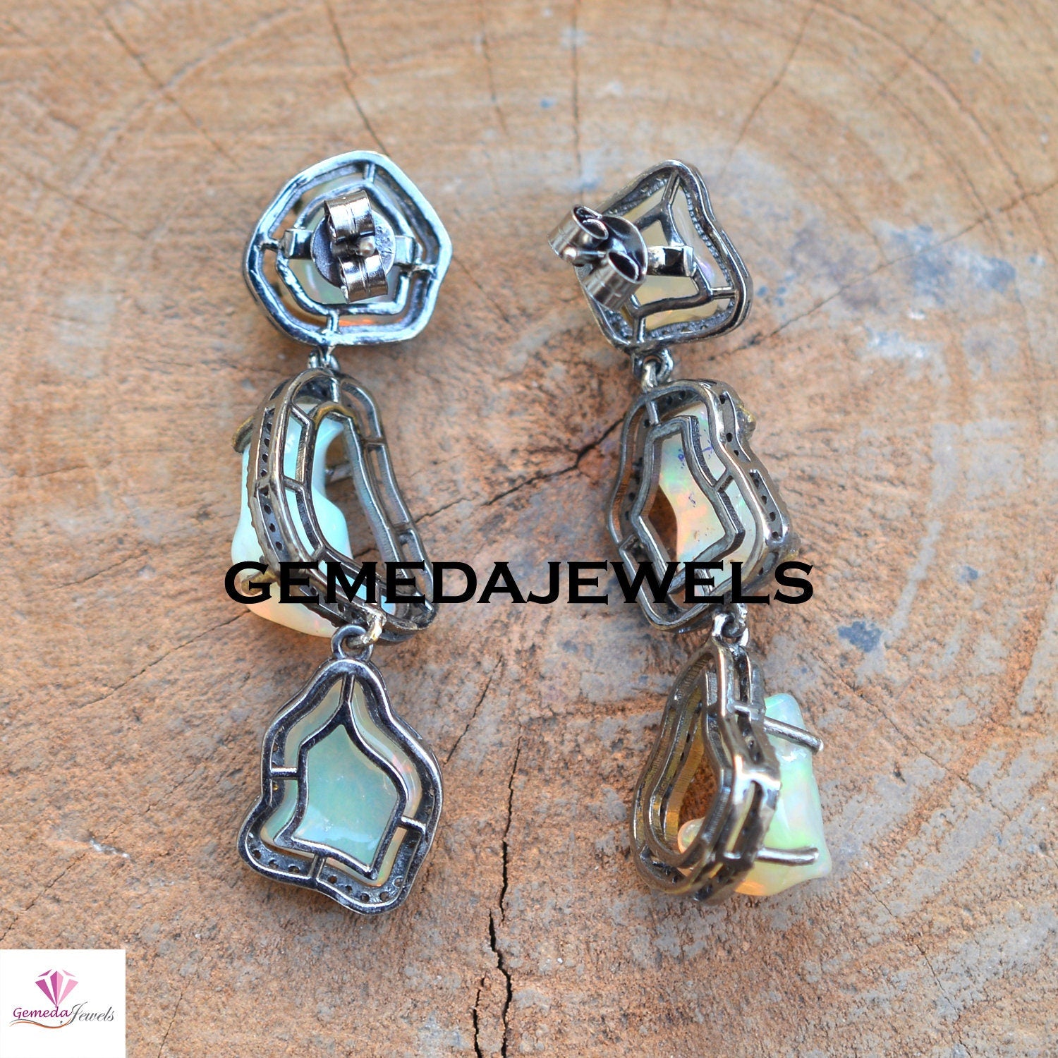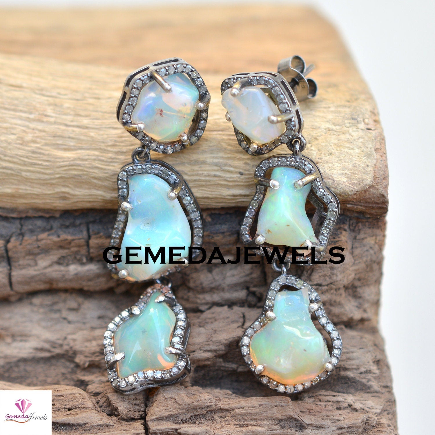 Sale Raw Opal Gemstone Necklace, Pave Diamond Earrings, Opal Necklace Earrings Jewelry Set, 925 Solid Silver, 18" Silver Link Chain Necklace