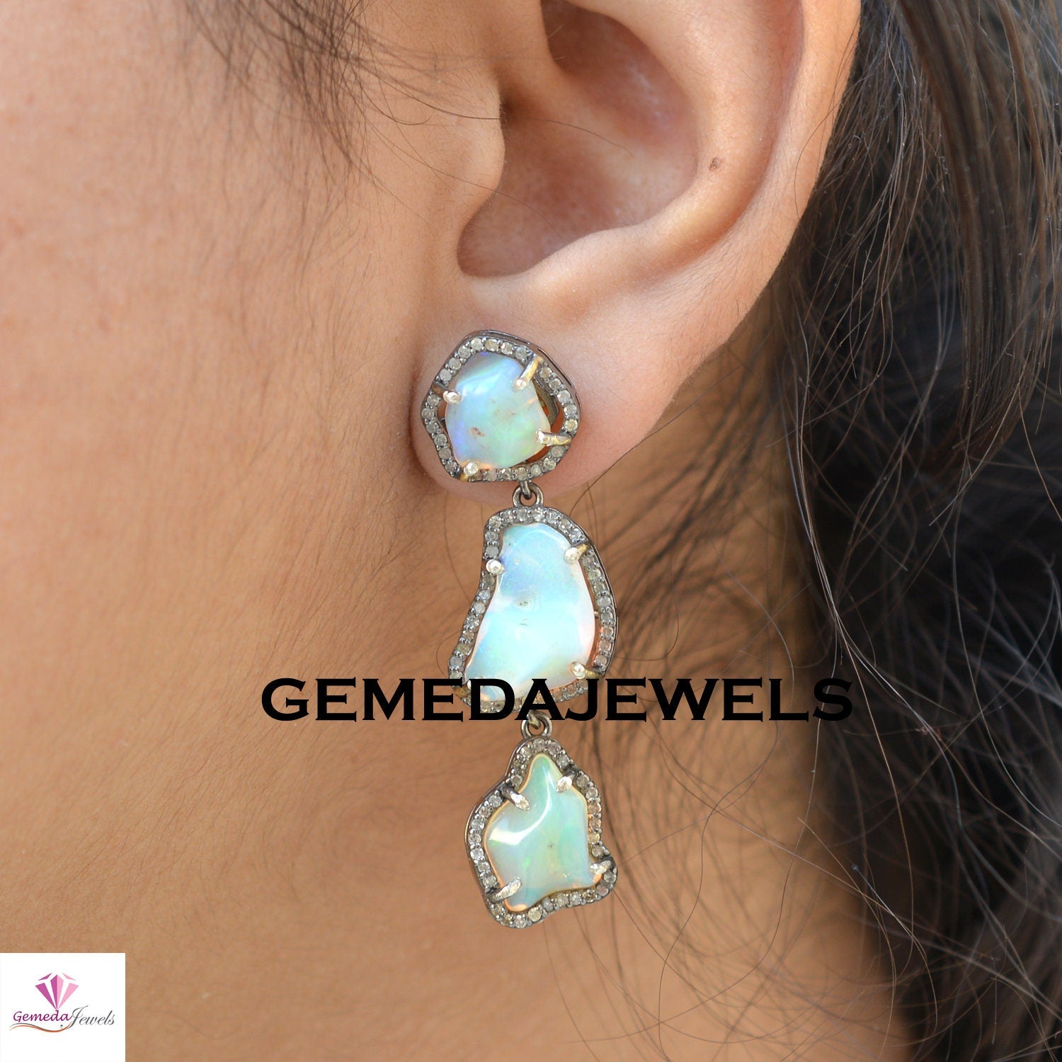 Sale Opal Gemstone Necklace, Pave Diamond Earrings, Opal Necklace Earrings Jewelry Set, 925 Solid Silver, 18" Silver Link Chain Necklace