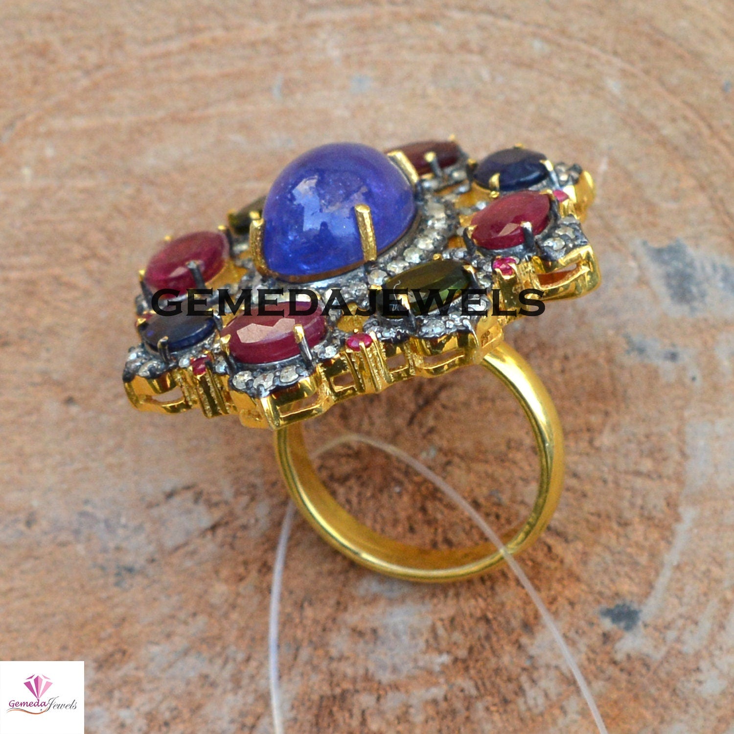 Sale! Real Tanzanite Silver Ring, Multi Gemstone Ring, Gemstone Floral Ring Jewelry, Pave Diamond Ring, 925 Silver Jewelry, Gold Filled Ring