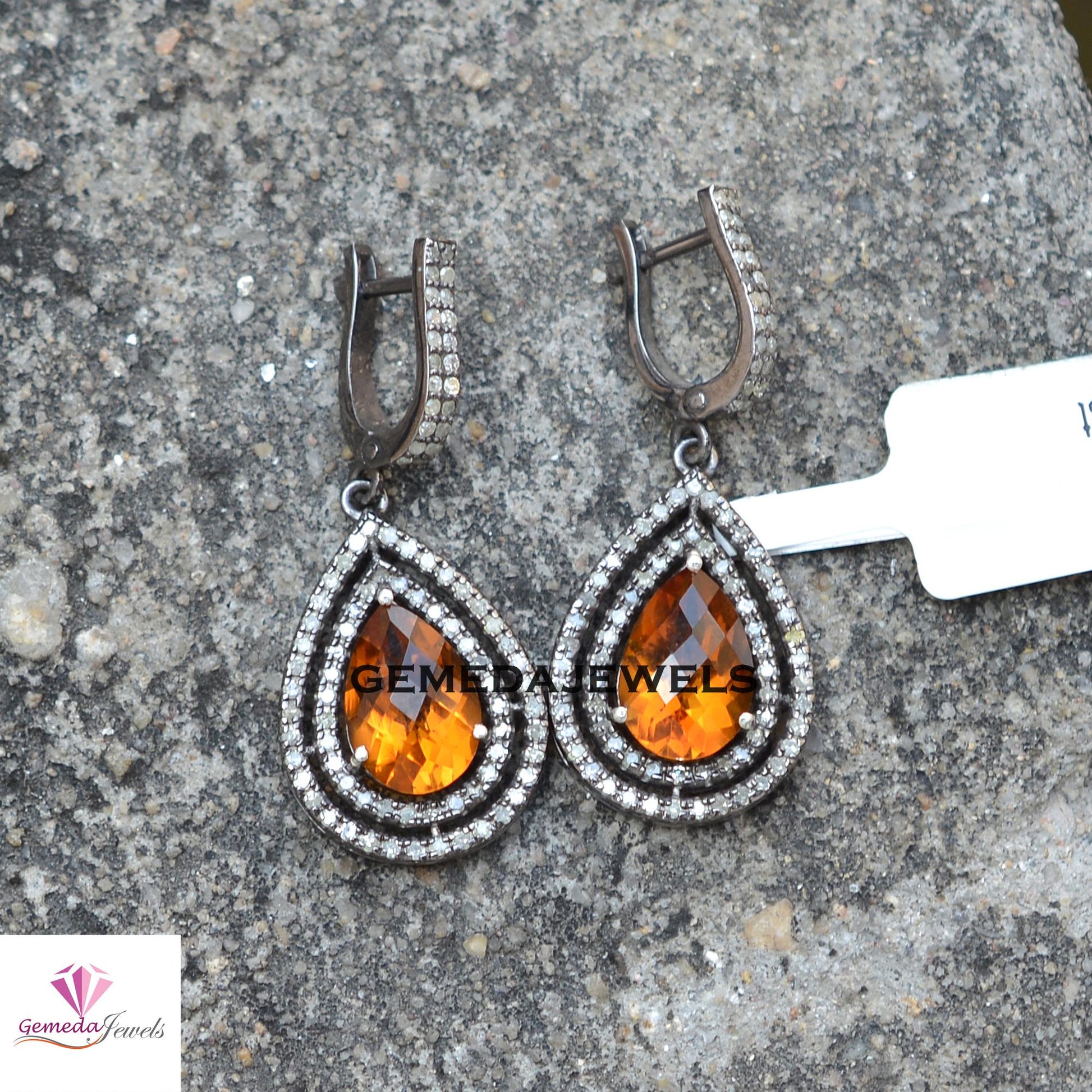 Sale!! Stunning Citrine Gemstone Earrings, Oxidized 925 Silver Jewelry, Pave Diamond Earrings, Gemstone Jewellery, Women's Gift Jewelry