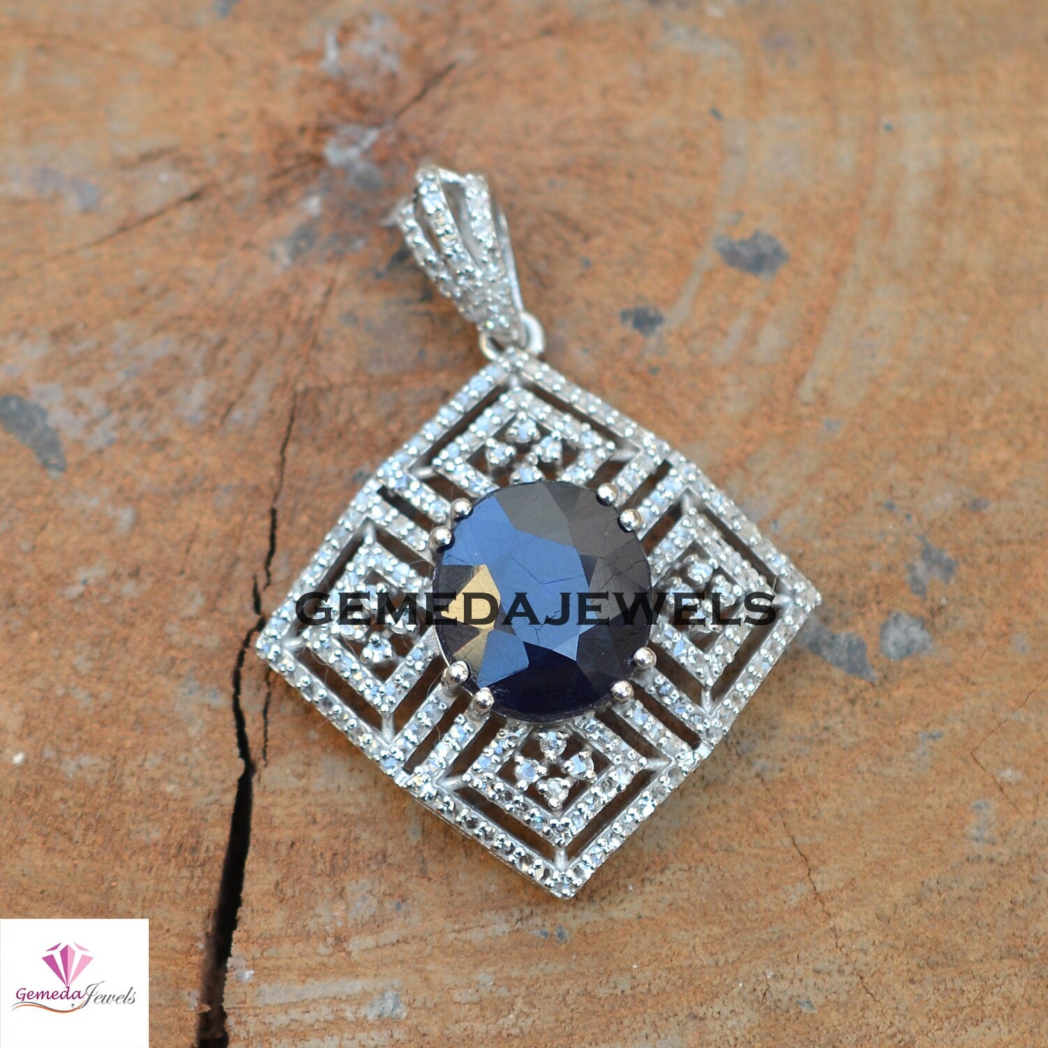 Sparkling Blue Sapphire Pendant, 925 Sterling Silver Jewelry, Pave Diamond Pendant, Gemstone Silver Jewelry, 16" Link Chain Pendant Necklace