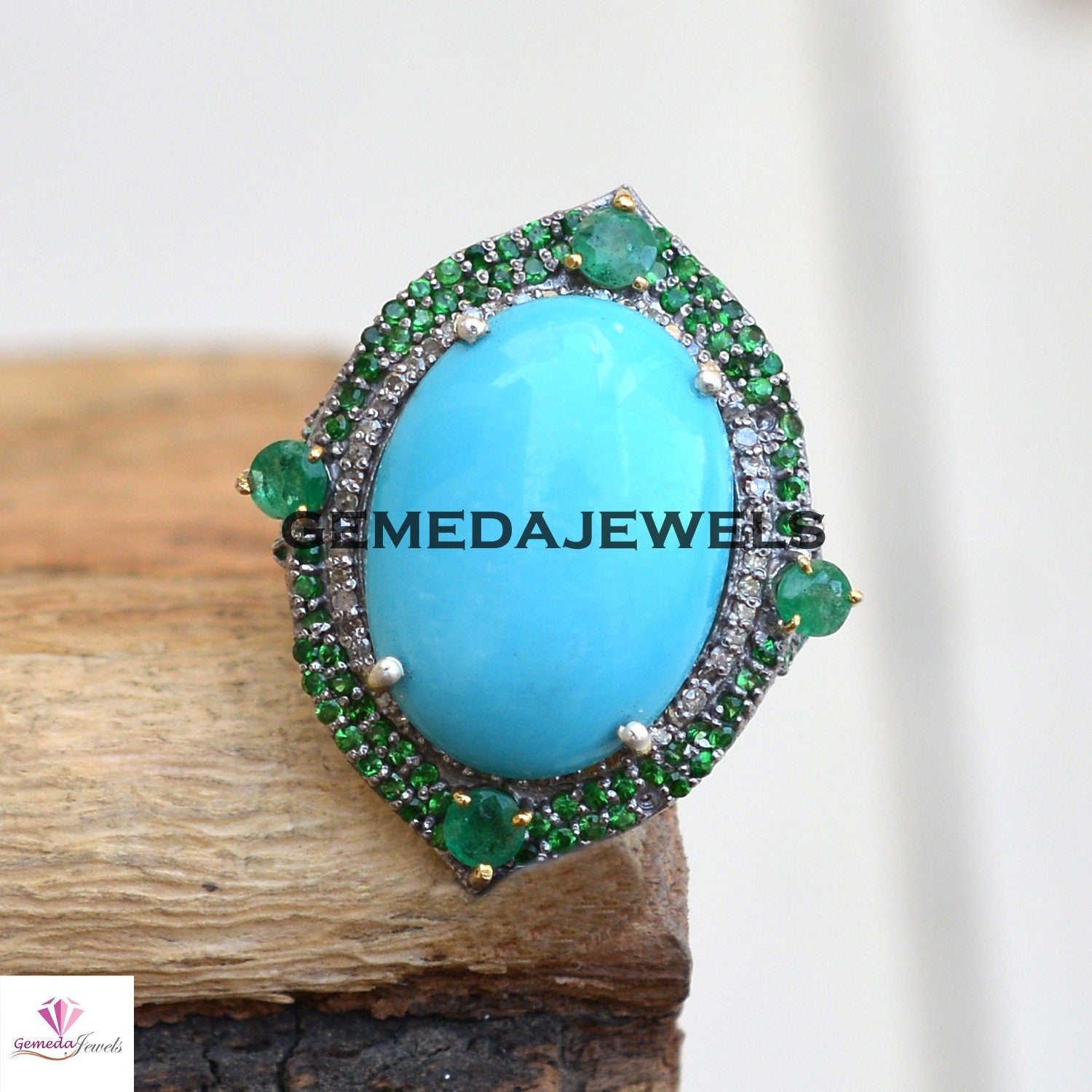 Stunning Blue Turquoise Ring, Pave Diamond Jewelry, Gemstone Diamond Ring, 925 Silver Ring Jewelry, Emerald Gemstone Ring, Wedding Jewelry