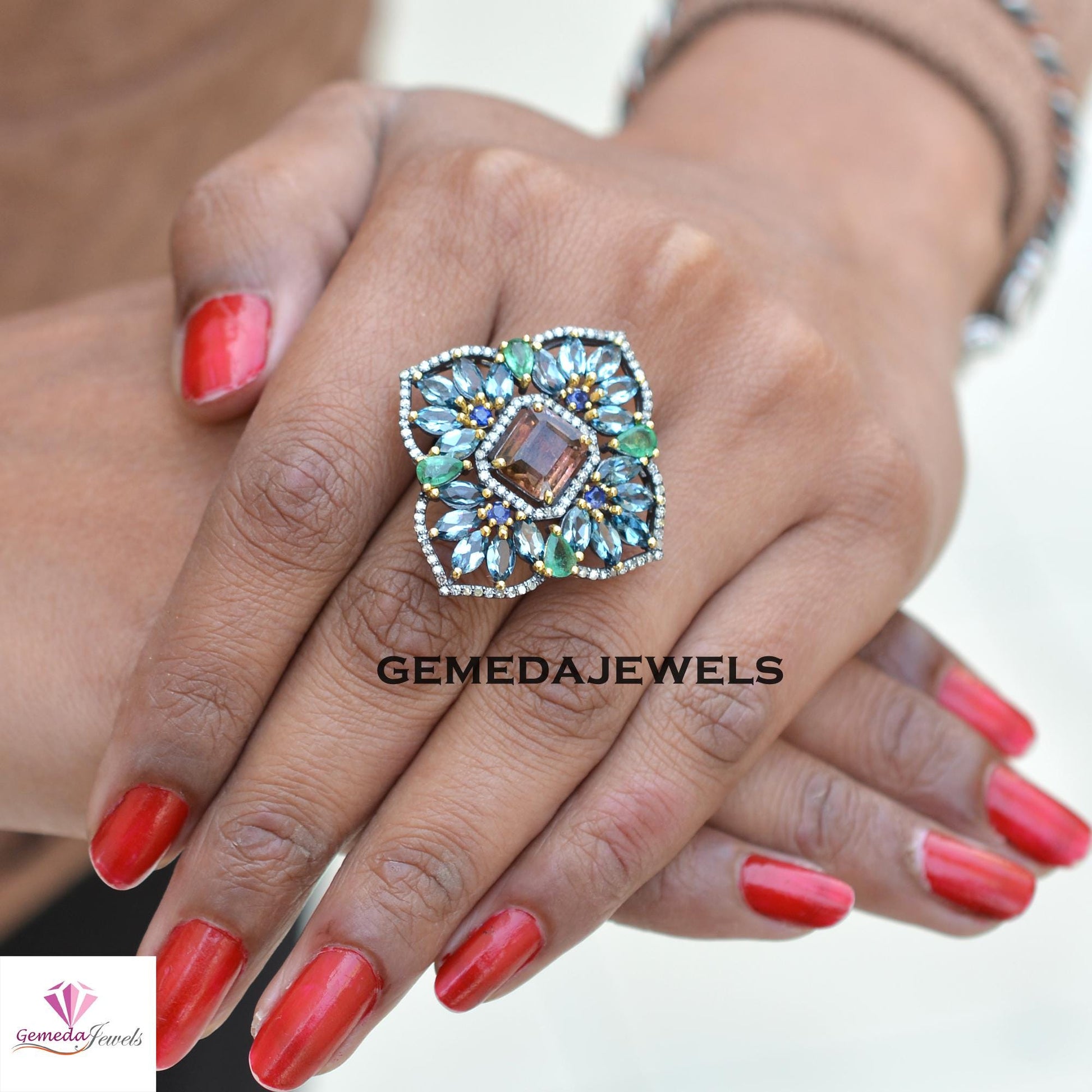 Tourmaline Flower Ring, Emerald 925 Silver Ring, Pave Diamond Jewelry, Sapphire Gemstone Ring, Rhodium Plated Jewelry, Valentine's Day Gift